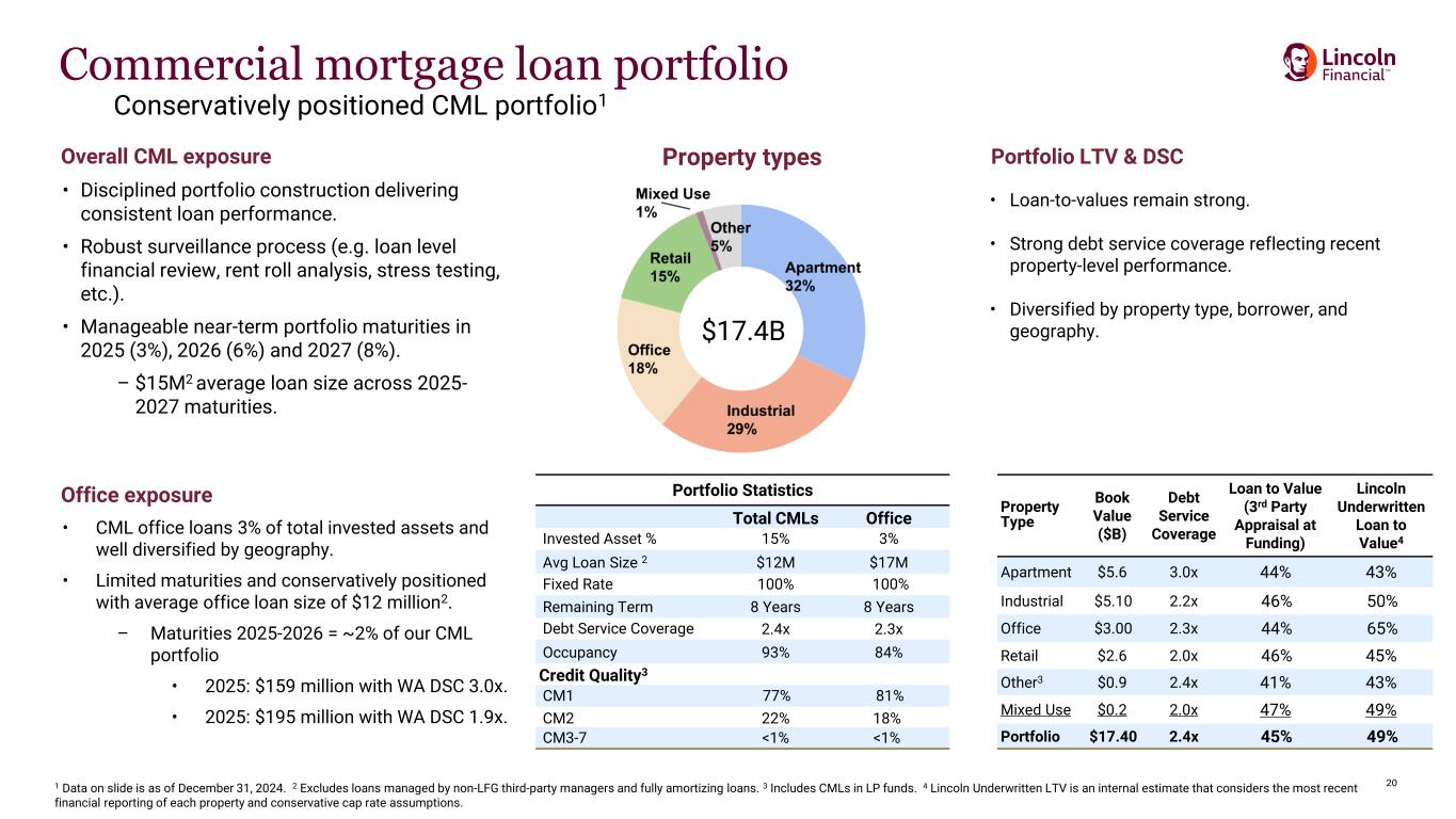 20 Commercial mortgage loan portfolio Conservatively positioned CML portfolio1 Overall CML exposure • Disciplined portfolio construction delivering consistent loan performance. • Robust surveillance process (e.g. loan level financial review, rent roll analysis, stress testing, etc.). • Manageable near-term portfolio maturities in 2025 (3%), 2026 (6%) and 2027 (8%). – $15M2 average loan size across 2025- 2027 maturities. Office exposure • CML office loans 3% of total invested assets and well diversified by geography. • Limited maturities and conservatively positioned with average office loan size of $12 million2. – Maturities 2025-2026 = ~2% of our CML portfolio • 2025: $159 million with WA DSC 3.0x. • 2025: $195 million with WA DSC 1.9x. $17.4B Property types 1 Data on slide is as of December 31, 2024. 2 Excludes loans managed by non-LFG third-party managers and fully amortizing loans. 3 Includes CMLs in LP funds. 4 Lincoln Underwritten LTV is an internal estimate that considers the most recent financial reporting of each property and conservative cap rate assumptions. Portfolio LTV & DSC • Loan-to-values remain strong. • Strong debt service coverage reflecting recent property-level performance. • Diversified by property type, borrower, and geography. Portfolio Statistics Total CMLs Office Invested Asset % 15% 3% Avg Loan Size 2 $12M $17M Fixed Rate 100% 100% Remaining Term 8 Years 8 Years Debt Service Coverage 2.4x 2.3x Occupancy 93% 84% Credit Quality3 CM1 77% 81% CM2 22% 18% CM3-7 <1% <1% Property Type Book Value ($B) Debt Service Coverage Loan to Value (3rd Party Appraisal at Funding) Lincoln Underwritten Loan to Value4 Apartment $5.6 3.0x 44% 43% Industrial $5.10 2.2x 46% 50% Office $3.00 2.3x 44% 65% Retail $2.6 2.0x 46% 45% Other3 $0.9 2.4x 41% 43% Mixed Use $0.2 2.0x 47% 49% Portfolio $17.40 2.4x 45% 49%