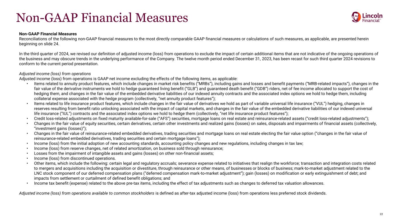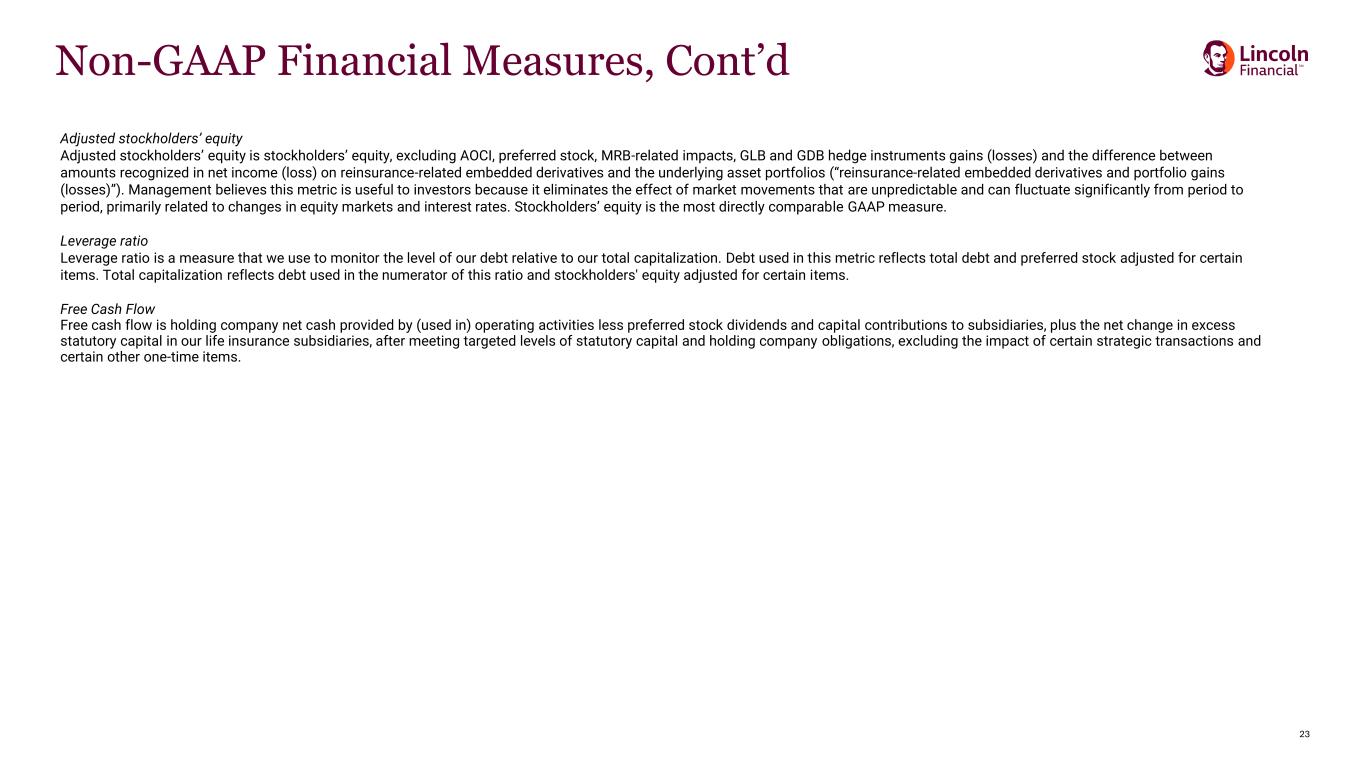 22 Non-GAAP Financial Measures Non-GAAP Financial Measures Reconciliations of the following non-GAAP financial measures to the most directly comparable GAAP financial measures or calculations of such measures, as applicable, are presented herein beginning on slide 24. In the third quarter of 2024, we revised our definition of adjusted income (loss) from operations to exclude the impact of certain additional items that are not indicative of the ongoing operations of the business and may obscure trends in the underlying performance of the Company. The twelve month period ended December 31, 2023, has been recast for such third quarter 2024 revisions to conform to the current period presentation. Adjusted income (loss) from operations Adjusted income (loss) from operations is GAAP net income excluding the effects of the following items, as applicable: • Items related to annuity product features, which include changes in market risk benefits (“MRBs”), including gains and losses and benefit payments (“MRB-related impacts”), changes in the fair value of the derivative instruments we hold to hedge guaranteed living benefit (“GLB”) and guaranteed death benefit (“GDB”) riders, net of fee income allocated to support the cost of hedging them, and changes in the fair value of the embedded derivative liabilities of our indexed annuity contracts and the associated index options we hold to hedge them, including collateral expense associated with the hedge program (collectively, “net annuity product features”); • Items related to life insurance product features, which include changes in the fair value of derivatives we hold as part of variable universal life insurance (“VUL”) hedging, changes in reserves resulting from benefit ratio unlocking associated with the impact of capital markets, and changes in the fair value of the embedded derivative liabilities of our indexed universal life insurance (“IUL”) contracts and the associated index options we hold to hedge them (collectively, “net life insurance product features”); • Credit loss-related adjustments on fixed maturity available-for-sale (“AFS”) securities, mortgage loans on real estate and reinsurance-related assets (“credit loss-related adjustments”); • Changes in the fair value of equity securities, certain derivatives, certain other investments and realized gains (losses) on sales, disposals and impairments of financial assets (collectively, “investment gains (losses)”); • Changes in the fair value of reinsurance-related embedded derivatives, trading securities and mortgage loans on real estate electing the fair value option (“changes in the fair value of reinsurance-related embedded derivatives, trading securities and certain mortgage loans”); • Income (loss) from the initial adoption of new accounting standards, accounting policy changes and new regulations, including changes in tax law; • Income (loss) from reserve changes, net of related amortization, on business sold through reinsurance; • Losses from the impairment of intangible assets and gains (losses) on other non-financial assets; • Income (loss) from discontinued operations. • Other items, which include the following: certain legal and regulatory accruals; severance expense related to initiatives that realign the workforce; transaction and integration costs related to mergers and acquisitions including the acquisition or divestiture, through reinsurance or other means, of businesses or blocks of business; mark-to-market adjustment related to the LNC stock component of our deferred compensation plans (“deferred compensation mark-to-market adjustment”); gain (losses) on modification or early extinguishment of debt; and impacts from settlement or curtailment of defined benefit obligations; and • Income tax benefit (expense) related to the above pre-tax items, including the effect of tax adjustments such as changes to deferred tax valuation allowances. Adjusted income (loss) from operations available to common stockholders is defined as after-tax adjusted income (loss) from operations less preferred stock dividends.