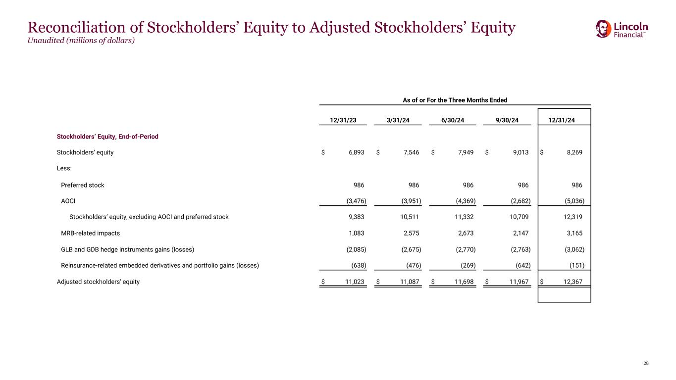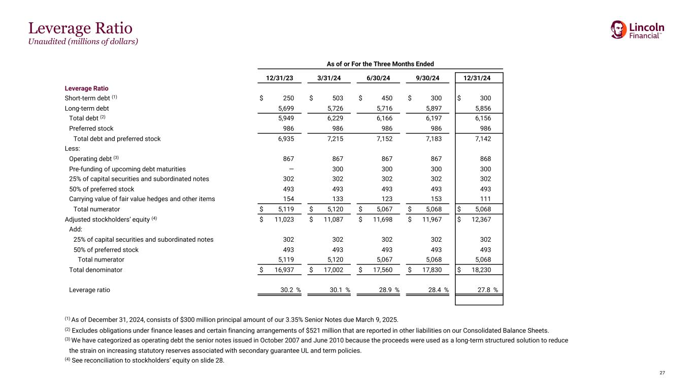 27 Leverage Ratio Unaudited (millions of dollars) As of or For the Three Months Ended 12/31/23 3/31/24 6/30/24 9/30/24 12/31/24 Leverage Ratio Short-term debt (1) $ 250 $ 503 $ 450 $ 300 $ 300 Long-term debt 5,699 5,726 5,716 5,897 5,856 Total debt (2) 5,949 6,229 6,166 6,197 6,156 Preferred stock 986 986 986 986 986 Total debt and preferred stock 6,935 7,215 7,152 7,183 7,142 Less: Operating debt (3) 867 867 867 867 868 Pre-funding of upcoming debt maturities — 300 300 300 300 25% of capital securities and subordinated notes 302 302 302 302 302 50% of preferred stock 493 493 493 493 493 Carrying value of fair value hedges and other items 154 133 123 153 111 Total numerator $ 5,119 $ 5,120 $ 5,067 $ 5,068 $ 5,068 Adjusted stockholders’ equity (4) $ 11,023 $ 11,087 $ 11,698 $ 11,967 $ 12,367 Add: 25% of capital securities and subordinated notes 302 302 302 302 302 50% of preferred stock 493 493 493 493 493 Total numerator 5,119 5,120 5,067 5,068 5,068 Total denominator $ 16,937 $ 17,002 $ 17,560 $ 17,830 $ 18,230 Leverage ratio 30.2 % 30.1 % 28.9 % 28.4 % 27.8 % (1) As of December 31, 2024, consists of $300 million principal amount of our 3.35% Senior Notes due March 9, 2025. (2) Excludes obligations under finance leases and certain financing arrangements of $521 million that are reported in other liabilities on our Consolidated Balance Sheets. (3) We have categorized as operating debt the senior notes issued in October 2007 and June 2010 because the proceeds were used as a long-term structured solution to reduce the strain on increasing statutory reserves associated with secondary guarantee UL and term policies. (4) See reconciliation to stockholders’ equity on slide 28.