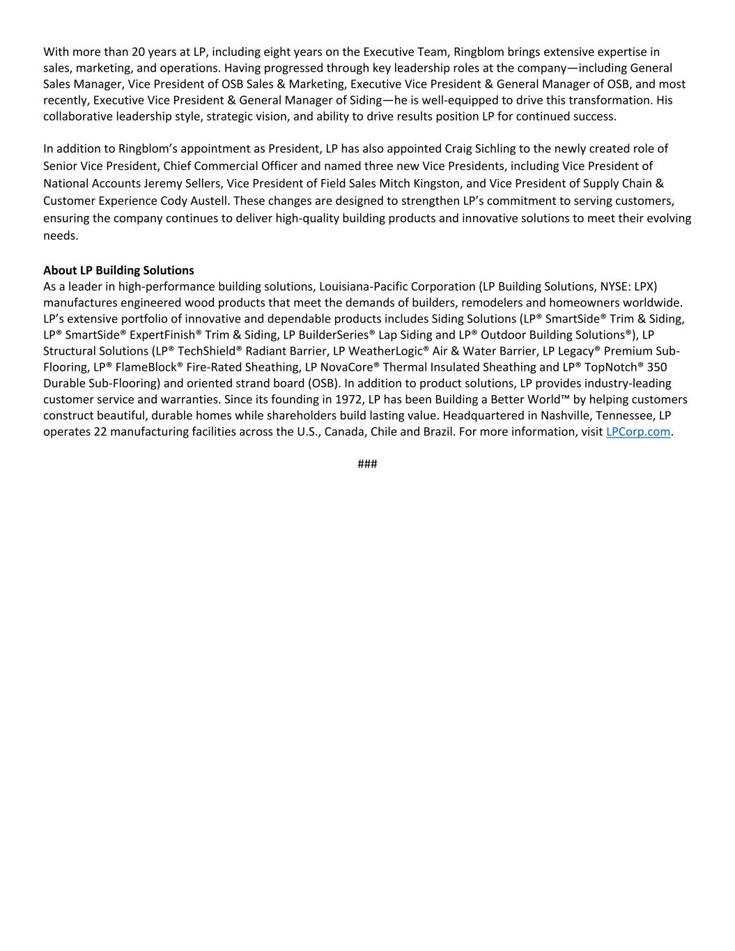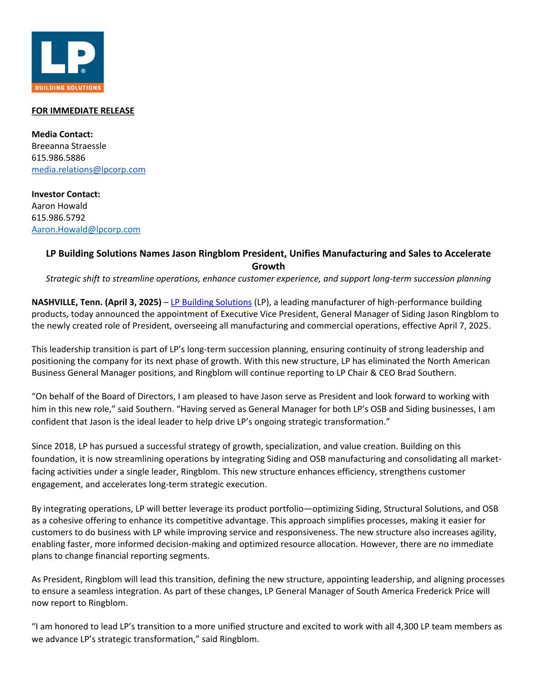 FOR IMMEDIATE RELEASE Media Contact: Breeanna Straessle 615.986.5886 media.relations@lpcorp.com Investor Contact: Aaron Howald 615.986.5792 Aaron.Howald@lpcorp.com LP Building Solutions Names Jason Ringblom President, Unifies Manufacturing and Sales to Accelerate Growth Strategic shift to streamline operations, enhance customer experience, and support long-term succession planning NASHVILLE, Tenn. (April 3, 2025) – LP Building Solutions (LP), a leading manufacturer of high-performance building products, today announced the appointment of Executive Vice President, General Manager of Siding Jason Ringblom to the newly created role of President, overseeing all manufacturing and commercial operations, effective April 7, 2025. This leadership transition is part of LP’s long-term succession planning, ensuring continuity of strong leadership and positioning the company for its next phase of growth. With this new structure, LP has eliminated the North American Business General Manager positions, and Ringblom will continue reporting to LP Chair & CEO Brad Southern. “On behalf of the Board of Directors, I am pleased to have Jason serve as President and look forward to working with him in this new role,” said Southern. “Having served as General Manager for both LP’s OSB and Siding businesses, I am confident that Jason is the ideal leader to help drive LP’s ongoing strategic transformation.” Since 2018, LP has pursued a successful strategy of growth, specialization, and value creation. Building on this foundation, it is now streamlining operations by integrating Siding and OSB manufacturing and consolidating all market- facing activities under a single leader, Ringblom. This new structure enhances efficiency, strengthens customer engagement, and accelerates long-term strategic execution. By integrating operations, LP will better leverage its product portfolio—optimizing Siding, Structural Solutions, and OSB as a cohesive offering to enhance its competitive advantage. This approach simplifies processes, making it easier for customers to do business with LP while improving service and responsiveness. The new structure also increases agility, enabling faster, more informed decision-making and optimized resource allocation. However, there are no immediate plans to change financial reporting segments. As President, Ringblom will lead this transition, defining the new structure, appointing leadership, and aligning processes to ensure a seamless integration. As part of these changes, LP General Manager of South America Frederick Price will now report to Ringblom. “I am honored to lead LP’s transition to a more unified structure and excited to work with all 4,300 LP team members as we advance LP’s strategic transformation,” said Ringblom.