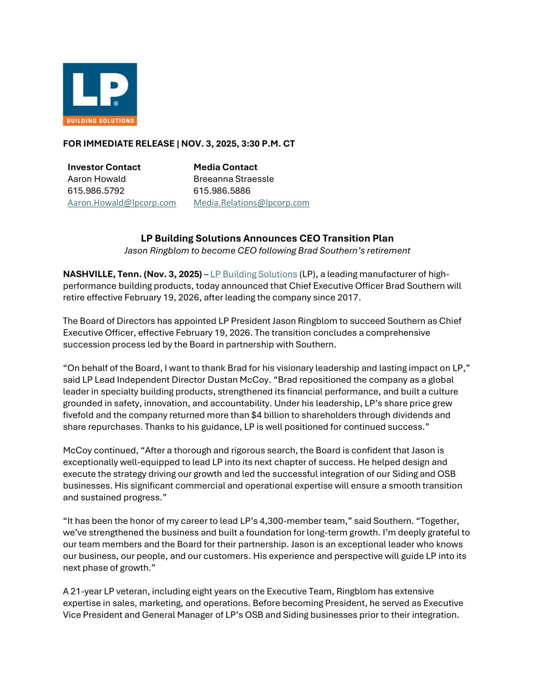 FOR IMMEDIATE RELEASE | NOV. 3, 2025, 3:30 P.M. CT Investor Contact Aaron Howald 615.986.5792 Aaron.Howald@lpcorp.com Media Contact Breeanna Straessle 615.986.5886 Media.Relations@lpcorp.com LP Building Solutions Announces CEO Transition Plan Jason Ringblom to become CEO following Brad Southern’s retirement NASHVILLE, Tenn. (Nov. 3, 2025) – LP Building Solutions (LP), a leading manufacturer of high- performance building products, today announced that Chief Executive Officer Brad Southern will retire effective February 19, 2026, after leading the company since 2017. The Board of Directors has appointed LP President Jason Ringblom to succeed Southern as Chief Executive Officer, effective February 19, 2026. The transition concludes a comprehensive succession process led by the Board in partnership with Southern. “On behalf of the Board, I want to thank Brad for his visionary leadership and lasting impact on LP,” said LP Lead Independent Director Dustan McCoy. “Brad repositioned the company as a global leader in specialty building products, strengthened its financial performance, and built a culture grounded in safety, innovation, and accountability. Under his leadership, LP’s share price grew fivefold and the company returned more than $4 billion to shareholders through dividends and share repurchases. Thanks to his guidance, LP is well positioned for continued success.” McCoy continued, “After a thorough and rigorous search, the Board is confident that Jason is exceptionally well-equipped to lead LP into its next chapter of success. He helped design and execute the strategy driving our growth and led the successful integration of our Siding and OSB businesses. His significant commercial and operational expertise will ensure a smooth transition and sustained progress.” “It has been the honor of my career to lead LP’s 4,300-member team,” said Southern. “Together, we’ve strengthened the business and built a foundation for long-term growth. I’m deeply grateful to our team members and the Board for their partnership. Jason is an exceptional leader who knows our business, our people, and our customers. His experience and perspective will guide LP into its next phase of growth.” A 21-year LP veteran, including eight years on the Executive Team, Ringblom has extensive expertise in sales, marketing, and operations. Before becoming President, he served as Executive Vice President and General Manager of LP’s OSB and Siding businesses prior to their integration.