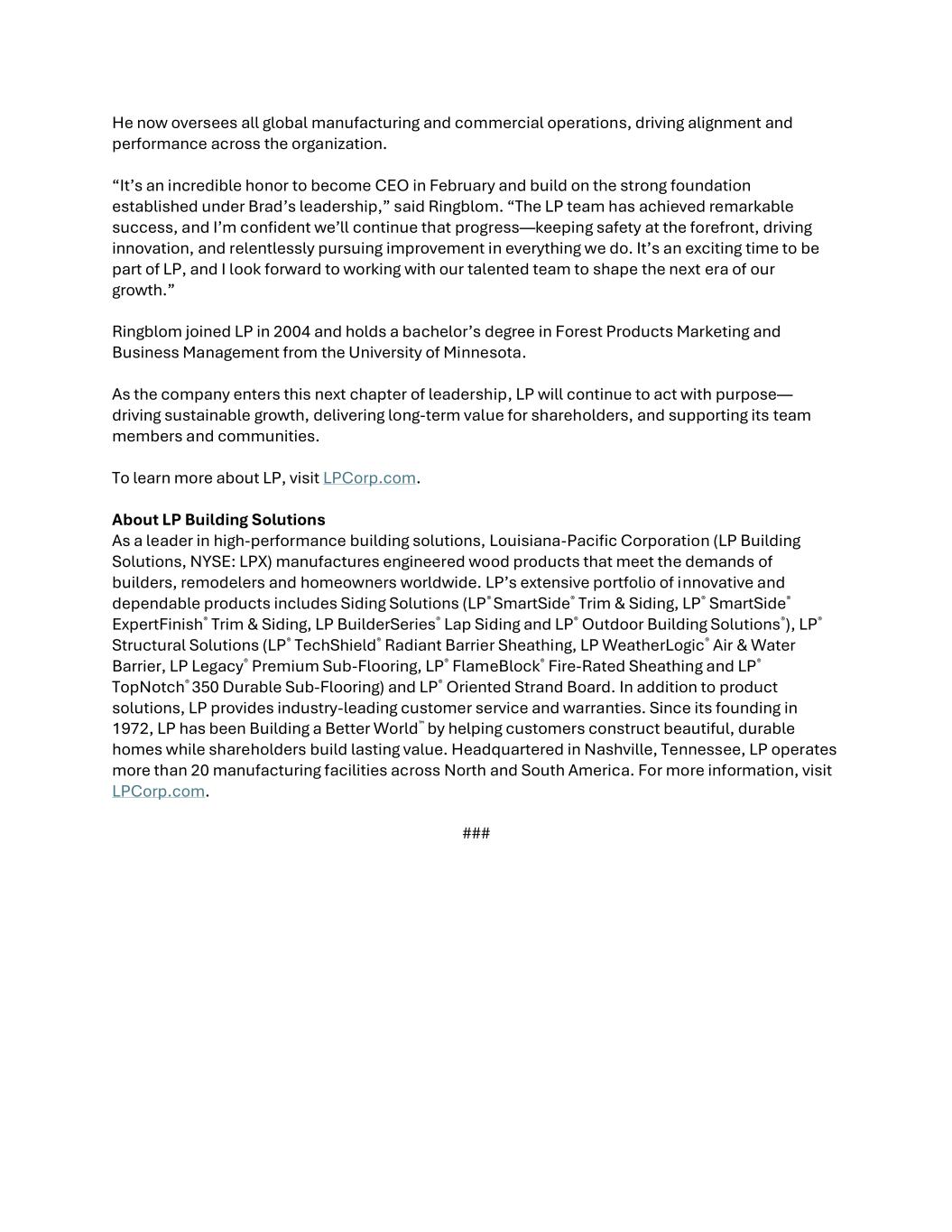 He now oversees all global manufacturing and commercial operations, driving alignment and performance across the organization. “It’s an incredible honor to become CEO in February and build on the strong foundation established under Brad’s leadership,” said Ringblom. “The LP team has achieved remarkable success, and I’m confident we’ll continue that progress—keeping safety at the forefront, driving innovation, and relentlessly pursuing improvement in everything we do. It’s an exciting time to be part of LP, and I look forward to working with our talented team to shape the next era of our growth.” Ringblom joined LP in 2004 and holds a bachelor’s degree in Forest Products Marketing and Business Management from the University of Minnesota. As the company enters this next chapter of leadership, LP will continue to act with purpose— driving sustainable growth, delivering long-term value for shareholders, and supporting its team members and communities. To learn more about LP, visit LPCorp.com. About LP Building Solutions As a leader in high-performance building solutions, Louisiana-Pacific Corporation (LP Building Solutions, NYSE: LPX) manufactures engineered wood products that meet the demands of builders, remodelers and homeowners worldwide. LP’s extensive portfolio of innovative and dependable products includes Siding Solutions (LP® SmartSide® Trim & Siding, LP® SmartSide® ExpertFinish® Trim & Siding, LP BuilderSeries® Lap Siding and LP® Outdoor Building Solutions®), LP® Structural Solutions (LP® TechShield® Radiant Barrier Sheathing, LP WeatherLogic® Air & Water Barrier, LP Legacy® Premium Sub-Flooring, LP® FlameBlock® Fire-Rated Sheathing and LP® TopNotch® 350 Durable Sub-Flooring) and LP® Oriented Strand Board. In addition to product solutions, LP provides industry-leading customer service and warranties. Since its founding in 1972, LP has been Building a Better World™ by helping customers construct beautiful, durable homes while shareholders build lasting value. Headquartered in Nashville, Tennessee, LP operates more than 20 manufacturing facilities across North and South America. For more information, visit LPCorp.com. ###