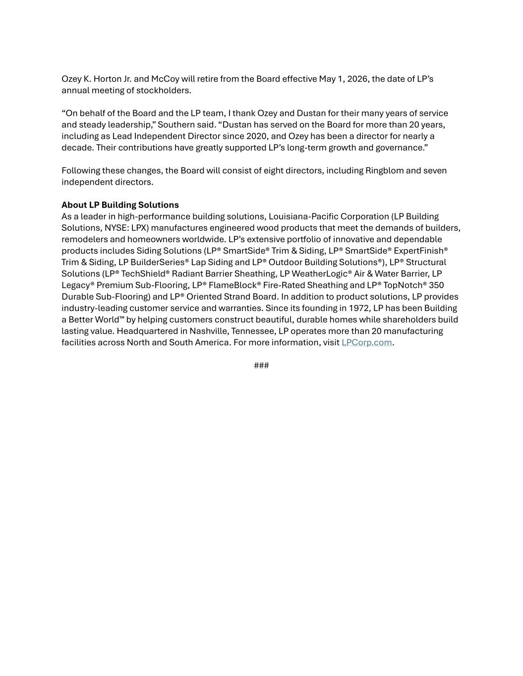 Ozey K. Horton Jr. and McCoy will retire from the Board effective May 1, 2026, the date of LP’s annual meeting of stockholders. “On behalf of the Board and the LP team, I thank Ozey and Dustan for their many years of service and steady leadership,” Southern said. “Dustan has served on the Board for more than 20 years, including as Lead Independent Director since 2020, and Ozey has been a director for nearly a decade. Their contributions have greatly supported LP’s long-term growth and governance.” Following these changes, the Board will consist of eight directors, including Ringblom and seven independent directors. About LP Building Solutions As a leader in high-performance building solutions, Louisiana-Pacific Corporation (LP Building Solutions, NYSE: LPX) manufactures engineered wood products that meet the demands of builders, remodelers and homeowners worldwide. LP’s extensive portfolio of innovative and dependable products includes Siding Solutions (LP® SmartSide® Trim & Siding, LP® SmartSide® ExpertFinish® Trim & Siding, LP BuilderSeries® Lap Siding and LP® Outdoor Building Solutions®), LP® Structural Solutions (LP® TechShield® Radiant Barrier Sheathing, LP WeatherLogic® Air & Water Barrier, LP Legacy® Premium Sub-Flooring, LP® FlameBlock® Fire-Rated Sheathing and LP® TopNotch® 350 Durable Sub-Flooring) and LP® Oriented Strand Board. In addition to product solutions, LP provides industry-leading customer service and warranties. Since its founding in 1972, LP has been Building a Better World™ by helping customers construct beautiful, durable homes while shareholders build lasting value. Headquartered in Nashville, Tennessee, LP operates more than 20 manufacturing facilities across North and South America. For more information, visit LPCorp.com. ###
