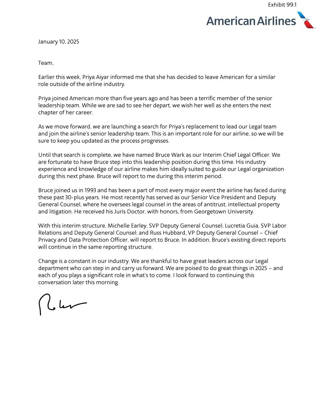 January 10, 2025 Team, Earlier this week, Priya Aiyar informed me that she has decided to leave American for a similar role outside of the airline industry. Priya joined American more than five years ago and has been a terrific member of the senior leadership team. While we are sad to see her depart, we wish her well as she enters the next chapter of her career. As we move forward, we are launching a search for Priya’s replacement to lead our Legal team and join the airline’s senior leadership team. This is an important role for our airline, so we will be sure to keep you updated as the process progresses. Until that search is complete, we have named Bruce Wark as our Interim Chief Legal Officer. We are fortunate to have Bruce step into this leadership position during this time. His industry experience and knowledge of our airline makes him ideally suited to guide our Legal organization during this next phase. Bruce will report to me during this interim period. Bruce joined us in 1993 and has been a part of most every major event the airline has faced during these past 30-plus years. He most recently has served as our Senior Vice President and Deputy General Counsel, where he oversees legal counsel in the areas of antitrust, intellectual property and litigation. He received his Juris Doctor, with honors, from Georgetown University. With this interim structure, Michelle Earley, SVP Deputy General Counsel; Lucretia Guia, SVP Labor Relations and Deputy General Counsel; and Russ Hubbard, VP Deputy General Counsel – Chief Privacy and Data Protection Officer, will report to Bruce. In addition, Bruce’s existing direct reports will continue in the same reporting structure. Change is a constant in our industry. We are thankful to have great leaders across our Legal department who can step in and carry us forward. We are poised to do great things in 2025 – and each of you plays a significant role in what’s to come. I look forward to continuing this conversation later this morning. Exhibit 99.1