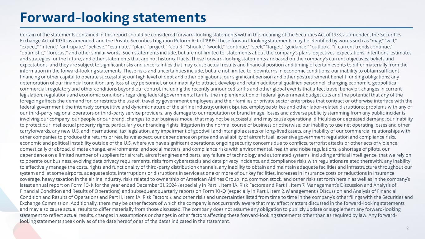 Certain of the statements contained in this report should be considered forward-looking statements within the meaning of the Securities Act of 1933, as amended, the Securities Exchange Act of 1934, as amended, and the Private Securities Litigation Reform Act of 1995. These forward-looking statements may be identified by words such as “may,” “will,” “expect,” “intend,” “anticipate,” “believe,” “estimate,” “plan,” “project,” “could,” “should,” “would,” “continue,” “seek,” “target,” “guidance,” “outlook,” “if current trends continue,” “optimistic,” “forecast” and other similar words. Such statements include, but are not limited to, statements about the company’s plans, objectives, expectations, intentions, estimates and strategies for the future, and other statements that are not historical facts. These forward-looking statements are based on the company’s current objectives, beliefs and expectations, and they are subject to significant risks and uncertainties that may cause actual results and financial position and timing of certain events to differ materially from the information in the forward-looking statements. These risks and uncertainties include, but are not limited to, downturns in economic conditions; our inability to obtain sufficient financing or other capital to operate successfully; our high level of debt and other obligations; our significant pension and other postretirement benefit funding obligations; any deterioration of our financial condition; any loss of key personnel, or our inability to attract, develop and retain additional qualified personnel; changing economic, geopolitical, commercial, regulatory and other conditions beyond our control, including the recently announced tariffs and other global events that affect travel behavior; changes in current legislation, regulations and economic conditions regarding federal governmental tariffs, the implementation of federal government budget cuts and the potential that any of the foregoing affects the demand for, or restricts the use of, travel by government employees and their families or private sector enterprises that contract or otherwise interface with the federal government; the intensely competitive and dynamic nature of the airline industry; union disputes, employee strikes and other labor-related disruptions; problems with any of our third-party regional operators or third-party service providers; any damage to our reputation or brand image; losses and adverse publicity stemming from any public incidents involving our company, our people or our brand; changes to our business model that may not be successful and may cause operational difficulties or decreased demand; our inability to protect our intellectual property rights, particularly our branding rights; litigation in the normal course of business or otherwise; our inability to use net operating losses and other carryforwards; any new U.S. and international tax legislation; any impairment of goodwill and intangible assets or long-lived assets; any inability of our commercial relationships with other companies to produce the returns or results we expect; our dependence on price and availability of aircraft fuel; extensive government regulation and compliance risks; economic and political instability outside of the U.S. where we have significant operations; ongoing security concerns due to conflicts, terrorist attacks or other acts of violence, domestically or abroad; climate change; environmental and social matters, and compliance risks with environmental, health and noise regulations; a shortage of pilots; our dependence on a limited number of suppliers for aircraft, aircraft engines and parts; any failure of technology and automated systems, including artificial intelligence, that we rely on to operate our business; evolving data privacy requirements, risks from cyberattacks and data privacy incidents, and compliance risks with regulations related therewith; any inability to effectively manage the costs, rights and functionality of third-party distribution channels; any inability to obtain and maintain adequate facilities and infrastructure throughout our system and, at some airports, adequate slots; interruptions or disruptions in service at one or more of our key facilities; increases in insurance costs or reductions in insurance coverage; heavy taxation in the airline industry; risks related to ownership of American Airlines Group Inc. common stock; and other risks set forth herein as well as in the company’s latest annual report on Form 10-K for the year ended December 31, 2024 (especially in Part I, Item 1A. Risk Factors and Part II, Item 7. Management’s Discussion and Analysis of Financial Condition and Results of Operations) and subsequent quarterly reports on Form 10-Q (especially in Part I, Item 2. Management’s Discussion and Analysis of Financial Condition and Results of Operations and Part II, Item 1A. Risk Factors ), and other risks and uncertainties listed from time to time in the company’s other filings with the Securities and Exchange Commission. Additionally, there may be other factors of which the company is not currently aware that may affect matters discussed in the forward-looking statements and may also cause actual results to differ materially from those discussed. The company does not assume any obligation to publicly update or supplement any forward-looking statement to reflect actual results, changes in assumptions or changes in other factors affecting these forward-looking statements other than as required by law. Any forward- looking statements speak only as of the date hereof or as of the dates indicated in the statement. Forward-looking statements 2