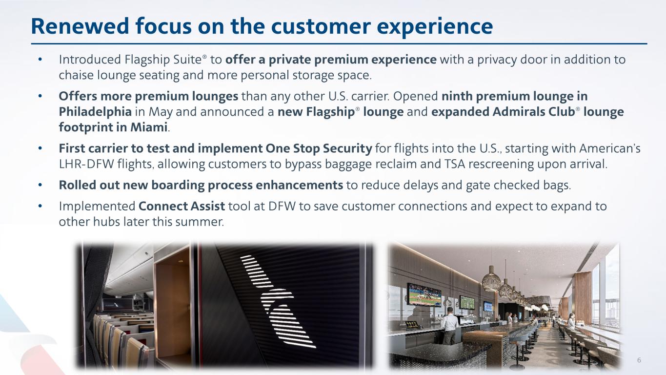 Renewed focus on the customer experience 6 • Introduced Flagship Suite® to offer a private premium experience with a privacy door in addition to chaise lounge seating and more personal storage space. • Offers more premium lounges than any other U.S. carrier. Opened ninth premium lounge in Philadelphia in May and announced a new Flagship® lounge and expanded Admirals Club® lounge footprint in Miami. • First carrier to test and implement One Stop Security for flights into the U.S., starting with American’s LHR-DFW flights, allowing customers to bypass baggage reclaim and TSA rescreening upon arrival. • Rolled out new boarding process enhancements to reduce delays and gate checked bags. • Implemented Connect Assist tool at DFW to save customer connections and expect to expand to other hubs later this summer.