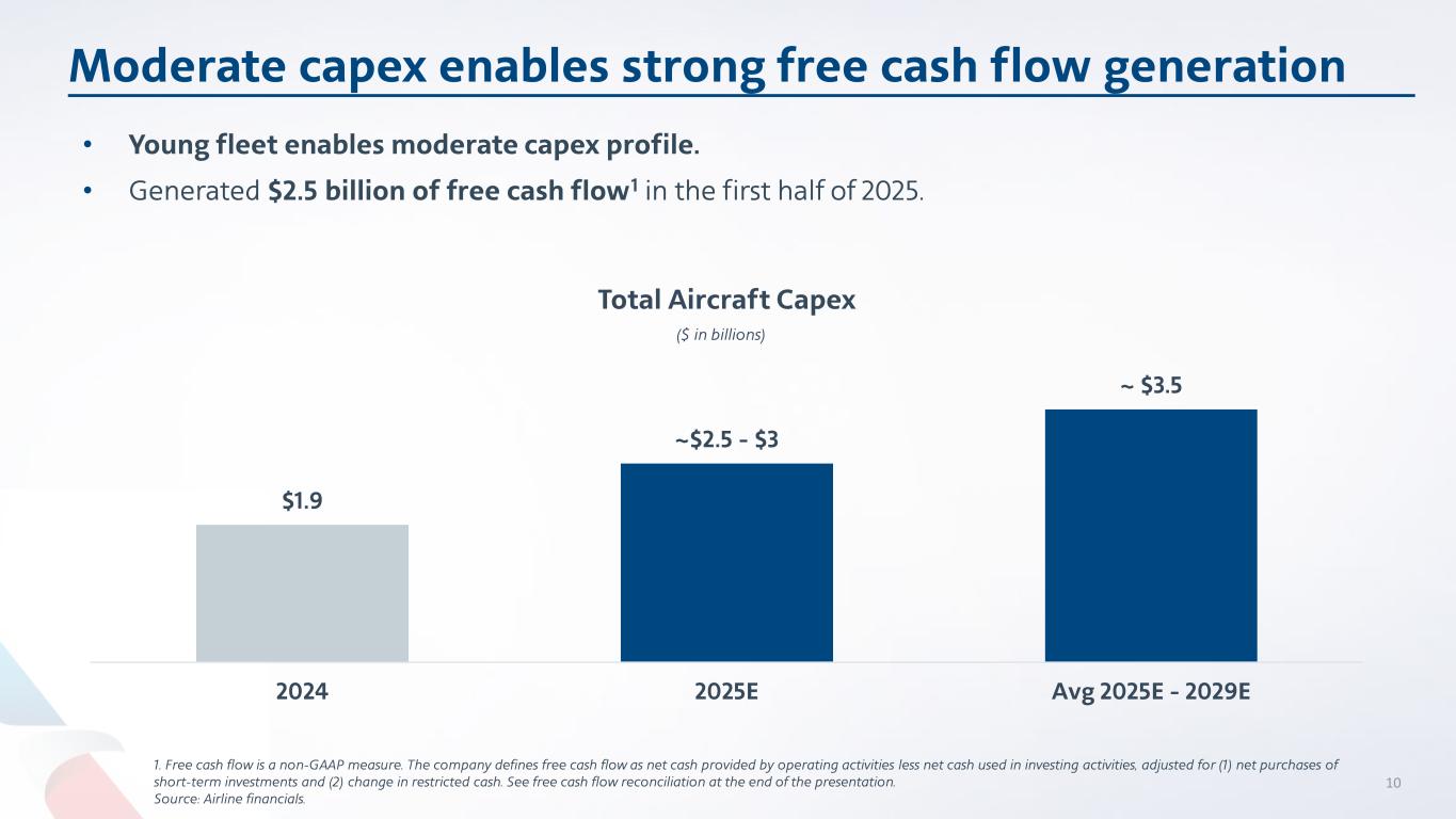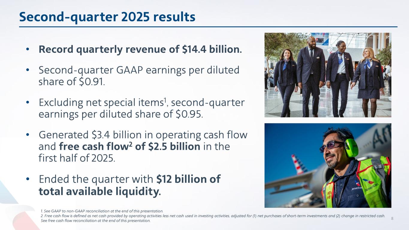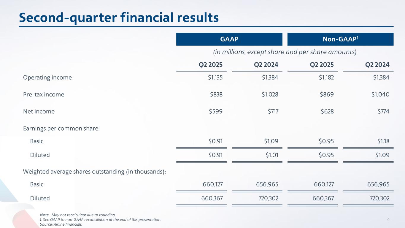 Second-quarter financial results Note: May not recalculate due to rounding. 1. See GAAP to non-GAAP reconciliation at the end of this presentation. Source: Airline financials. GAAP Non-GAAP1 (in millions, except share and per share amounts) Q2 2025 Q2 2024 Q2 2025 Q2 2024 Operating income $1,135 $1,384 $1,182 $1,384 Pre-tax income $838 $1,028 $869 $1,040 Net income $599 $717 $628 $774 Earnings per common share: Basic $0.91 $1.09 $0.95 $1.18 Diluted $0.91 $1.01 $0.95 $1.09 Weighted average shares outstanding (in thousands): Basic 660,127 656,965 660,127 656,965 Diluted 660,367 720,302 660,367 720,302 9