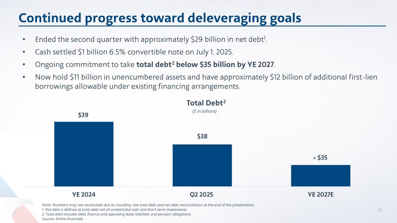 $1.9 ~$2.5 - $3 ~ $3.5 2024 2025E Avg 2025E - 2029E • Young fleet enables moderate capex profile. • Generated $2.5 billion of free cash flow1 in the first half of 2025. Moderate capex enables strong free cash flow generation Total Aircraft Capex ($ in billions) 10 1. Free cash flow is a non-GAAP measure. The company defines free cash flow as net cash provided by operating activities less net cash used in investing activities, adjusted for (1) net purchases of short-term investments and (2) change in restricted cash. See free cash flow reconciliation at the end of the presentation. Source: Airline financials.