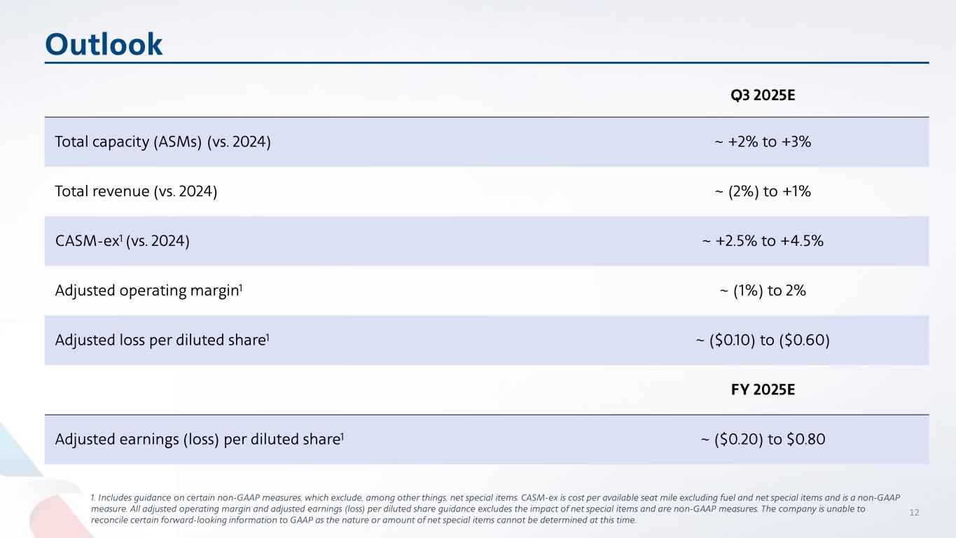 Outlook 1. Includes guidance on certain non-GAAP measures, which exclude, among other things, net special items. CASM-ex is cost per available seat mile excluding fuel and net special items and is a non-GAAP measure. All adjusted operating margin and adjusted earnings (loss) per diluted share guidance excludes the impact of net special items and are non-GAAP measures. The company is unable to reconcile certain forward-looking information to GAAP as the nature or amount of net special items cannot be determined at this time. Q3 2025E Total capacity (ASMs) (vs. 2024) ~ +2% to +3% Total revenue (vs. 2024) ~ (2%) to +1% CASM-ex1 (vs. 2024) ~ +2.5% to +4.5% Adjusted operating margin1 ~ (1%) to 2% Adjusted loss per diluted share1 ~ ($0.10) to ($0.60) FY 2025E Adjusted earnings (loss) per diluted share1 ~ ($0.20) to $0.80 12