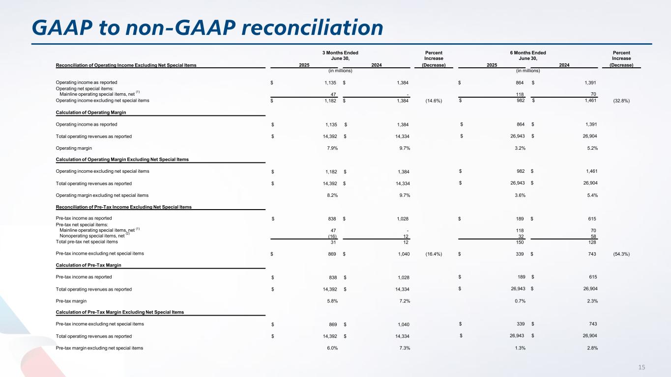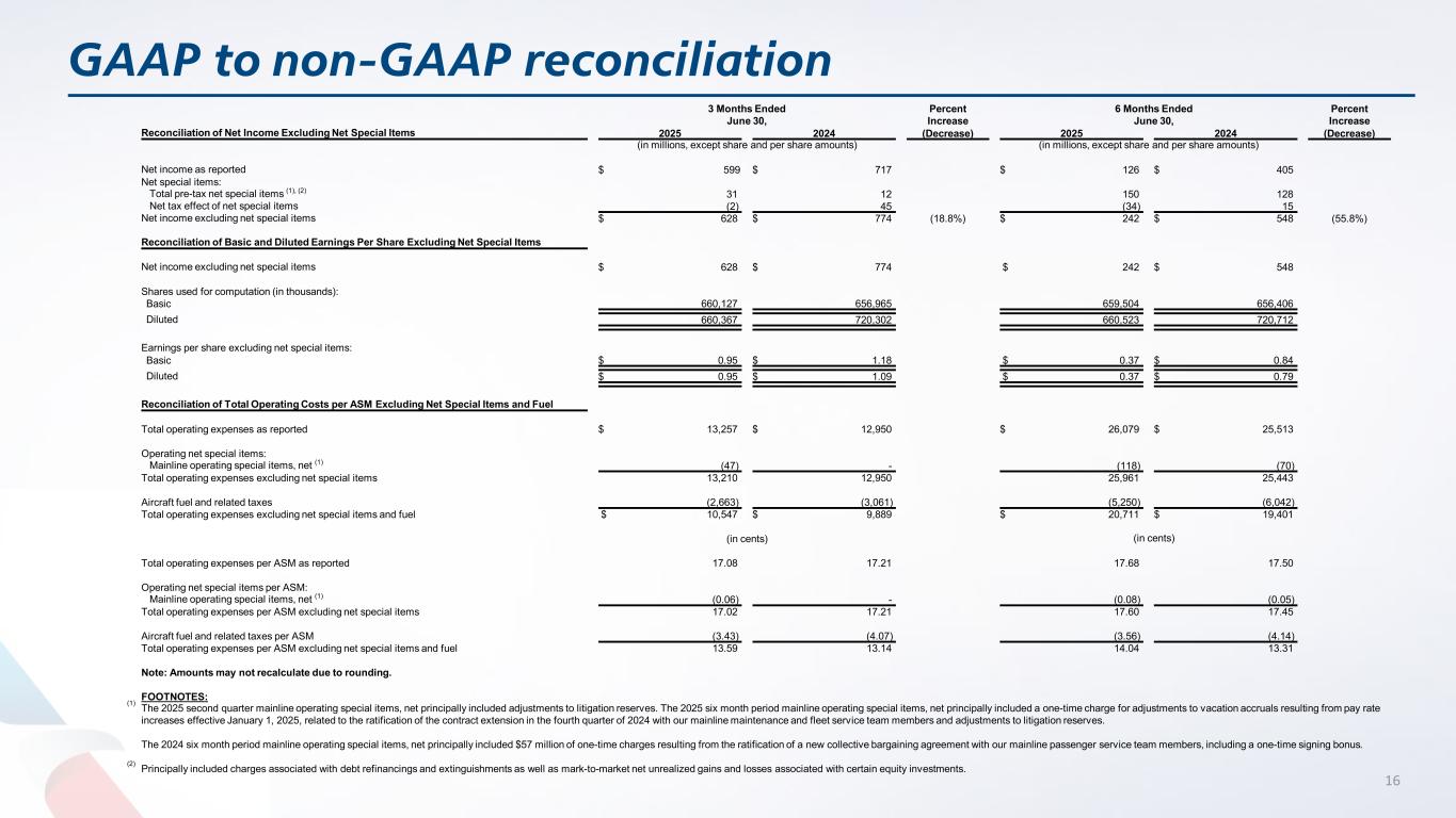 GAAP to non-GAAP reconciliation Reconciliation of Operating Income Excluding Net Special Items 3 Months Ended June 30, Percent Increase 6 Months Ended June 30, Percent Increase 2025 2024 (Decrease) 2025 2024 (Decrease) (in millions) (in millions) Operating income as reported $ 1,135 $ 1,384 $ 864 $ 1,391 Operating net special items: Mainline operating special items, net (1) 47 - 118 70 Operating income excluding net special items $ 1,182 $ 1,384 (14.6%) $ 982 $ 1,461 (32.8%) Calculation of Operating Margin Operating income as reported $ 1,135 $ 1,384 $ 864 $ 1,391 Total operating revenues as reported $ 14,392 $ 14,334 $ 26,943 $ 26,904 Operating margin 7.9% 9.7% 3.2% 5.2% Calculation of Operating Margin Excluding Net Special Items Operating income excluding net special items $ 1,182 $ 1,384 $ 982 $ 1,461 Total operating revenues as reported $ 14,392 $ 14,334 $ 26,943 $ 26,904 Operating margin excluding net special items 8.2% 9.7% 3.6% 5.4% Reconciliation of Pre-Tax Income Excluding Net Special Items Pre-tax income as reported $ 838 $ 1,028 $ 189 $ 615 Pre-tax net special items: Mainline operating special items, net (1) 47 - 118 70 Nonoperating special items, net (2) (16) 12 32 58 Total pre-tax net special items 31 12 150 128 Pre-tax income excluding net special items $ 869 $ 1,040 (16.4%) $ 339 $ 743 (54.3%) Calculation of Pre-Tax Margin Pre-tax income as reported $ 838 $ 1,028 $ 189 $ 615 Total operating revenues as reported $ 14,392 $ 14,334 $ 26,943 $ 26,904 Pre-tax margin 5.8% 7.2% 0.7% 2.3% Calculation of Pre-Tax Margin Excluding Net Special Items Pre-tax income excluding net special items $ 869 $ 1,040 $ 339 $ 743 Total operating revenues as reported $ 14,392 $ 14,334 $ 26,943 $ 26,904 Pre-tax margin excluding net special items 6.0% 7.3% 1.3% 2.8% 15