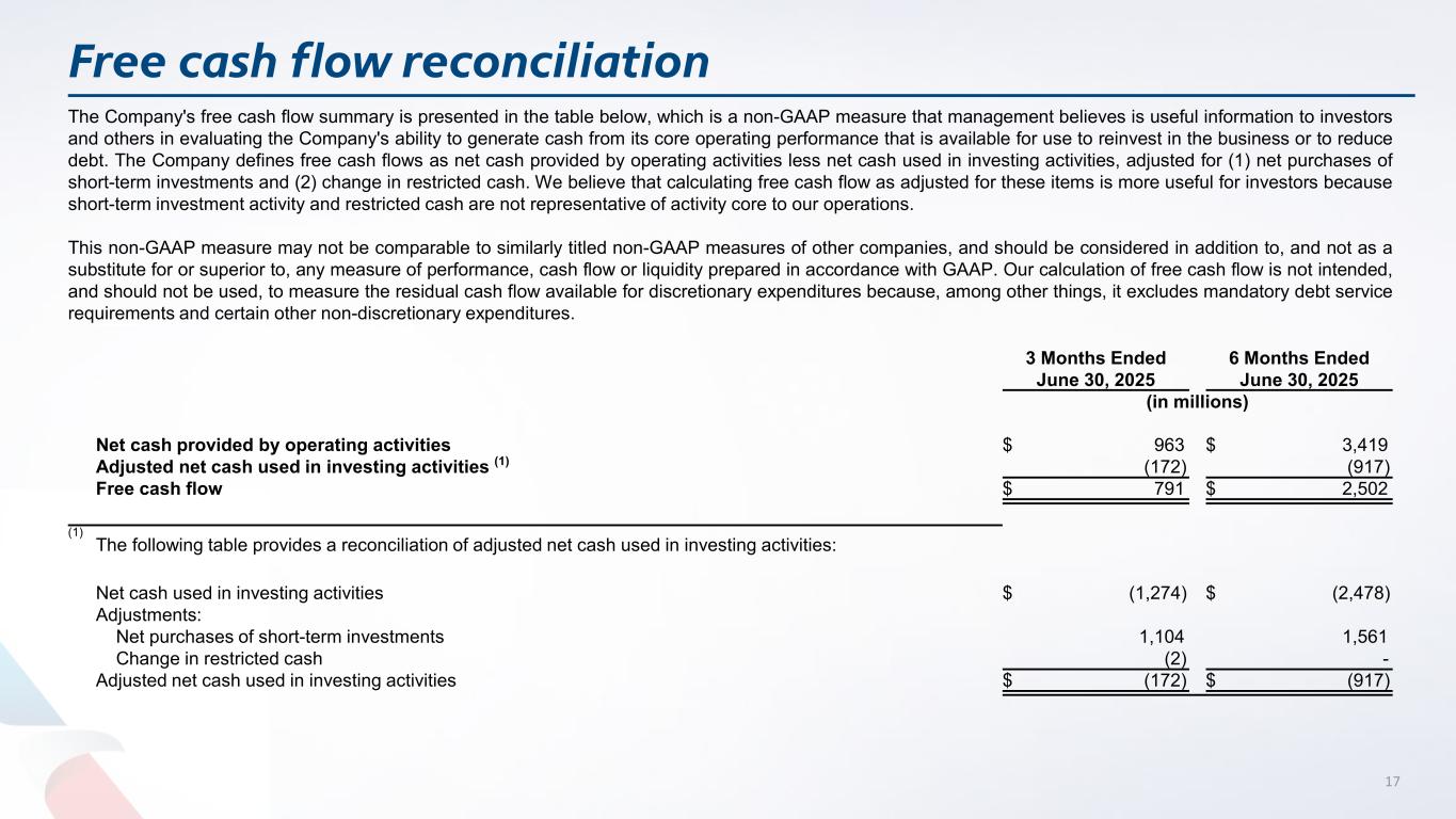 Free cash flow reconciliation The Company's free cash flow summary is presented in the table below, which is a non-GAAP measure that management believes is useful information to investors and others in evaluating the Company's ability to generate cash from its core operating performance that is available for use to reinvest in the business or to reduce debt. The Company defines free cash flows as net cash provided by operating activities less net cash used in investing activities, adjusted for (1) net purchases of short-term investments and (2) change in restricted cash. We believe that calculating free cash flow as adjusted for these items is more useful for investors because short-term investment activity and restricted cash are not representative of activity core to our operations. This non-GAAP measure may not be comparable to similarly titled non-GAAP measures of other companies, and should be considered in addition to, and not as a substitute for or superior to, any measure of performance, cash flow or liquidity prepared in accordance with GAAP. Our calculation of free cash flow is not intended, and should not be used, to measure the residual cash flow available for discretionary expenditures because, among other things, it excludes mandatory debt service requirements and certain other non-discretionary expenditures. 3 Months Ended June 30, 2025 6 Months Ended June 30, 2025 (in millions) Net cash provided by operating activities $ 963 $ 3,419 Adjusted net cash used in investing activities (1) (172) (917) Free cash flow $ 791 $ 2,502 (1) The following table provides a reconciliation of adjusted net cash used in investing activities: Net cash used in investing activities $ (1,274) $ (2,478) Adjustments: Net purchases of short-term investments 1,104 1,561 Change in restricted cash (2) - Adjusted net cash used in investing activities $ (172) $ (917) 17