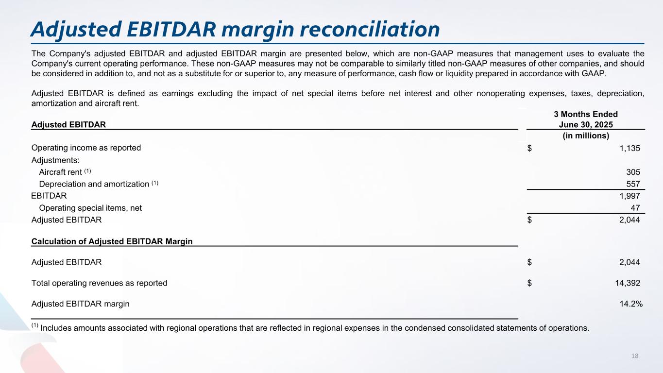 Adjusted EBITDAR margin reconciliation The Company's adjusted EBITDAR and adjusted EBITDAR margin are presented below, which are non-GAAP measures that management uses to evaluate the Company's current operating performance. These non-GAAP measures may not be comparable to similarly titled non-GAAP measures of other companies, and should be considered in addition to, and not as a substitute for or superior to, any measure of performance, cash flow or liquidity prepared in accordance with GAAP. Adjusted EBITDAR is defined as earnings excluding the impact of net special items before net interest and other nonoperating expenses, taxes, depreciation, amortization and aircraft rent. 3 Months Ended Adjusted EBITDAR June 30, 2025 (in millions) Operating income as reported $ 1,135 Adjustments: Aircraft rent (1) 305 Depreciation and amortization (1) 557 EBITDAR 1,997 Operating special items, net 47 Adjusted EBITDAR $ 2,044 Calculation of Adjusted EBITDAR Margin Adjusted EBITDAR $ 2,044 Total operating revenues as reported $ 14,392 Adjusted EBITDAR margin 14.2% (1) Includes amounts associated with regional operations that are reflected in regional expenses in the condensed consolidated statements of operations. 18