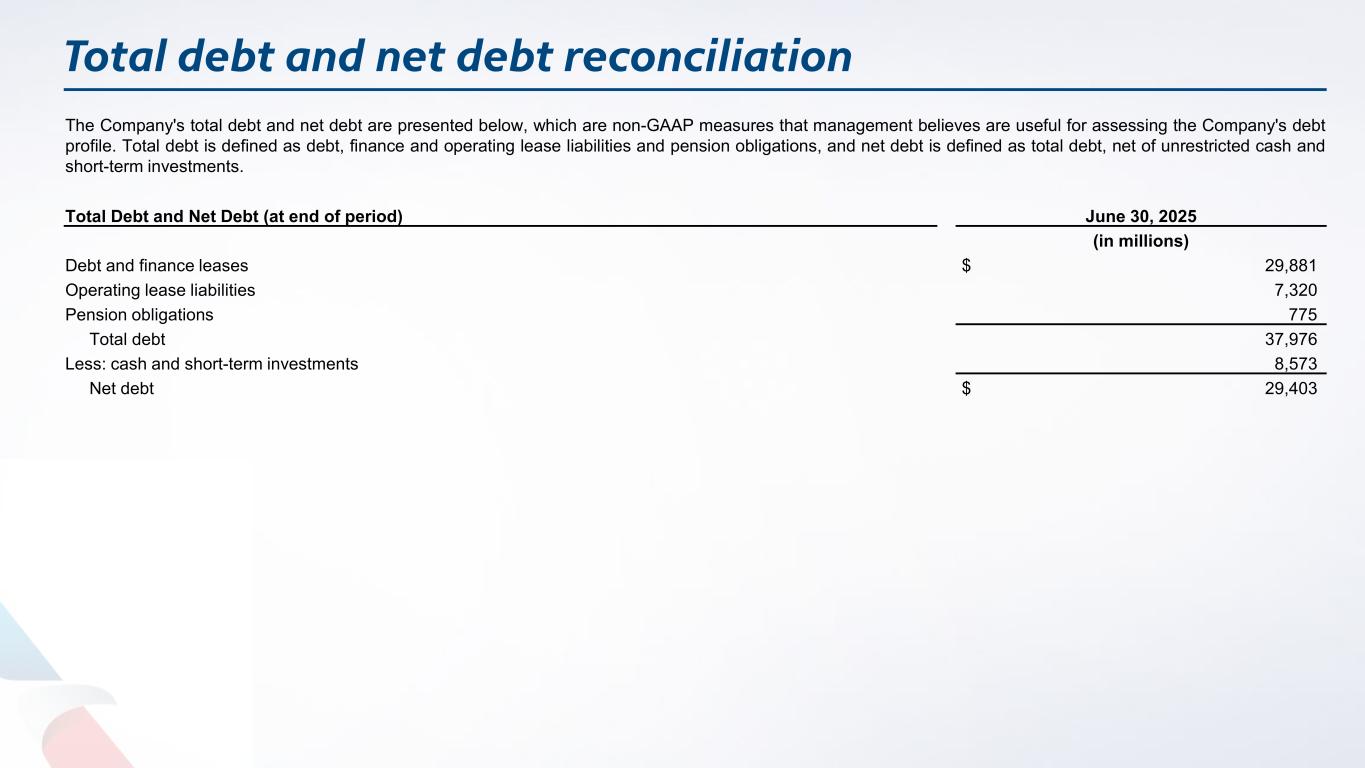 Total debt and net debt reconciliation The Company's total debt and net debt are presented below, which are non-GAAP measures that management believes are useful for assessing the Company's debt profile. Total debt is defined as debt, finance and operating lease liabilities and pension obligations, and net debt is defined as total debt, net of unrestricted cash and short-term investments. Total Debt and Net Debt (at end of period) June 30, 2025 (in millions) Debt and finance leases $ 29,881 Operating lease liabilities 7,320 Pension obligations 775 Total debt 37,976 Less: cash and short-term investments 8,573 Net debt $ 29,403