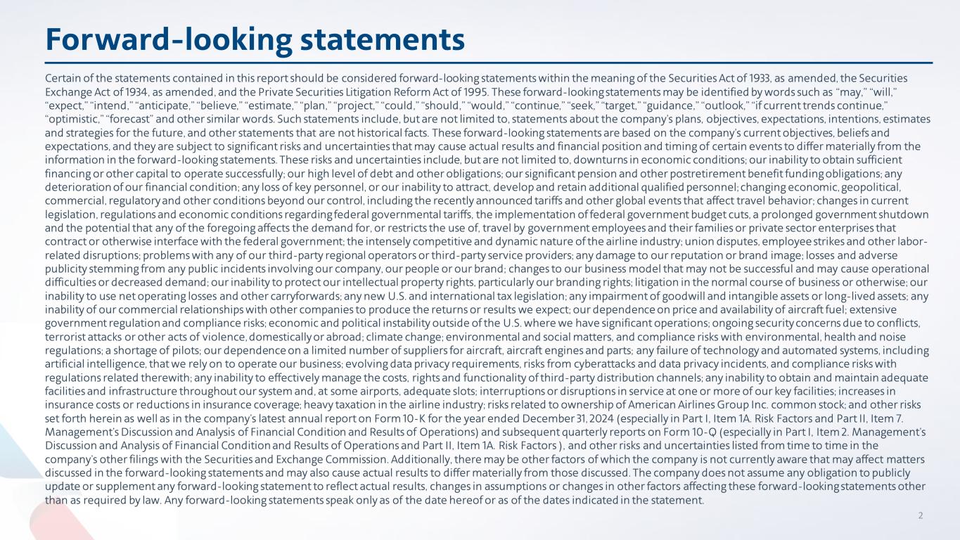 Certain of the statements contained in this report should be considered forward-looking statements within the meaning of the Securities Act of 1933, as amended, the Securities Exchange Act of 1934, as amended, and the Private Securities Litigation Reform Act of 1995. These forward-looking statements may be identified by words such as “may,” “will,” “expect,” “intend,” “anticipate,” “believe,” “estimate,” “plan,” “project,” “could,” “should,” “would,” “continue,” “seek,” “target,” “guidance,” “outlook,” “if current trends continue,” “optimistic,” “forecast” and other similar words. Such statements include, but are not limited to, statements about the company’s plans, objectives, expectations, intentions, estimates and strategies for the future, and other statements that are not historical facts. These forward-looking statements are based on the company’s current objectives, beliefs and expectations, and they are subject to significant risks and uncertainties that may cause actual results and financial position and timing of certain events to differ materially from the information in the forward-looking statements. These risks and uncertainties include, but are not limited to, downturns in economic conditions; our inability to obtain sufficient financing or other capital to operate successfully; our high level of debt and other obligations; our significant pension and other postretirement benefit funding obligations; any deterioration of our financial condition; any loss of key personnel, or our inability to attract, develop and retain additional qualified personnel; changing economic, geopolitical, commercial, regulatory and other conditions beyond our control, including the recently announced tariffs and other global events that affect travel behavior; changes in current legislation, regulations and economic conditions regarding federal governmental tariffs, the implementation of federal government budget cuts, a prolonged government shutdown and the potential that any of the foregoing affects the demand for, or restricts the use of, travel by government employees and their families or private sector enterprises that contract or otherwise interface with the federal government; the intensely competitive and dynamic nature of the airline industry; union disputes, employee strikes and other labor- related disruptions; problems with any of our third-party regional operators or third-party service providers; any damage to our reputation or brand image; losses and adverse publicity stemming from any public incidents involving our company, our people or our brand; changes to our business model that may not be successful and may cause operational difficulties or decreased demand; our inability to protect our intellectual property rights, particularly our branding rights; litigation in the normal course of business or otherwise; our inability to use net operating losses and other carryforwards; any new U.S. and international tax legislation; any impairment of goodwill and intangible assets or long-lived assets; any inability of our commercial relationships with other companies to produce the returns or results we expect; our dependence on price and availability of aircraft fuel; extensive government regulation and compliance risks; economic and political instability outside of the U.S. where we have significant operations; ongoing security concerns due to conflicts, terrorist attacks or other acts of violence, domestically or abroad; climate change; environmental and social matters, and compliance risks with environmental, health and noise regulations; a shortage of pilots; our dependence on a limited number of suppliers for aircraft, aircraft engines and parts; any failure of technology and automated systems, including artificial intelligence, that we rely on to operate our business; evolving data privacy requirements, risks from cyberattacks and data privacy incidents, and compliance risks with regulations related therewith; any inability to effectively manage the costs, rights and functionality of third-party distribution channels; any inability to obtain and maintain adequate facilities and infrastructure throughout our system and, at some airports, adequate slots; interruptions or disruptions in service at one or more of our key facilities; increases in insurance costs or reductions in insurance coverage; heavy taxation in the airline industry; risks related to ownership of American Airlines Group Inc. common stock; and other risks set forth herein as well as in the company’s latest annual report on Form 10-K for the year ended December 31, 2024 (especially in Part I, Item 1A. Risk Factors and Part II, Item 7. Management’s Discussion and Analysis of Financial Condition and Results of Operations) and subsequent quarterly reports on Form 10-Q (especially in Part I, Item 2. Management’s Discussion and Analysis of Financial Condition and Results of Operations and Part II, Item 1A. Risk Factors ), and other risks and uncertainties listed from time to time in the company’s other filings with the Securities and Exchange Commission. Additionally, there may be other factors of which the company is not currently aware that may affect matters discussed in the forward-looking statements and may also cause actual results to differ materially from those discussed. The company does not assume any obligation to publicly update or supplement any forward-looking statement to reflect actual results, changes in assumptions or changes in other factors affecting these forward-looking statements other than as required by law. Any forward-looking statements speak only as of the date hereof or as of the dates indicated in the statement. Forward-looking statements 2