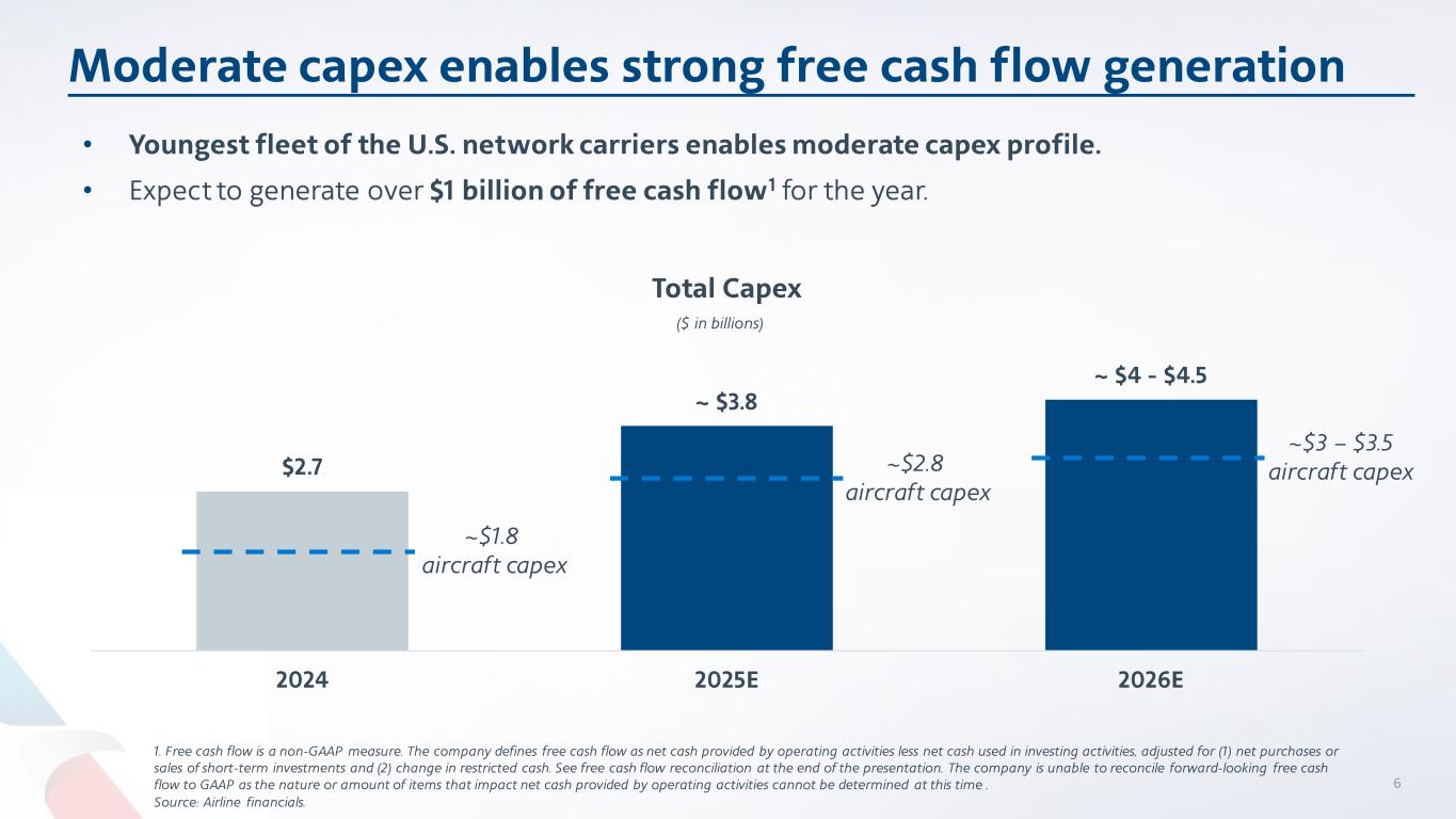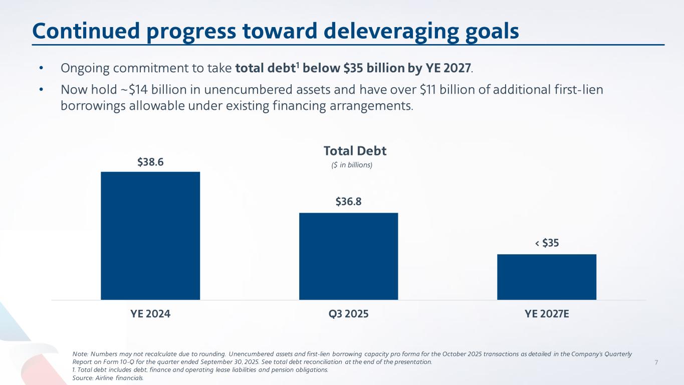 $2.7 ~ $3.8 ~ $4 - $4.5 2024 2025E 2026E • Youngest fleet of the U.S. network carriers enables moderate capex profile. • Expect to generate over $1 billion of free cash flow1 for the year. Moderate capex enables strong free cash flow generation Total Capex ($ in billions) 6 1. Free cash flow is a non-GAAP measure. The company defines free cash flow as net cash provided by operating activities less net cash used in investing activities, adjusted for (1) net purchases or sales of short-term investments and (2) change in restricted cash. See free cash flow reconciliation at the end of the presentation. The company is unable to reconcile forward-looking free cash flow to GAAP as the nature or amount of items that impact net cash provided by operating activities cannot be determined at this time . Source: Airline financials. ~$2.8 aircraft capex ~$3 – $3.5 aircraft capex ~$1.8 aircraft capex
