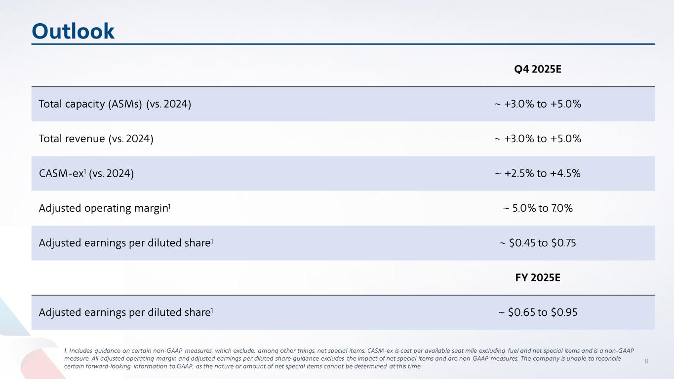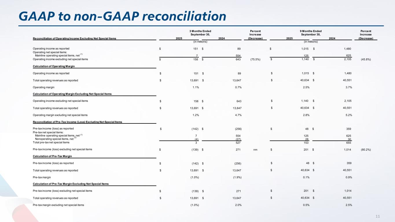 GAAP to non-GAAP reconciliation Reconciliation of Operating Income Excluding Net Special Items 3 Months Ended September 30, Percent Increase 9 Months Ended September 30, Percent Increase 2025 2024 (Decrease) 2025 2024 (Decrease) (in millions) (in millions) Operating income as reported $ 151 $ 89 $ 1,015 $ 1,480 Operating net special items: Mainline operating special items, net (1) 7 554 125 625 Operating income excluding net special items $ 158 $ 643 (75.5%) $ 1,140 $ 2,105 (45.8%) Calculation of Operating Margin Operating income as reported $ 151 $ 89 $ 1,015 $ 1,480 Total operating revenues as reported $ 13,691 $ 13,647 $ 40,634 $ 40,551 Operating margin 1.1% 0.7% 2.5% 3.7% Calculation of Operating Margin Excluding Net Special Items Operating income excluding net special items $ 158 $ 643 $ 1,140 $ 2,105 Total operating revenues as reported $ 13,691 $ 13,647 $ 40,634 $ 40,551 Operating margin excluding net special items 1.2% 4.7% 2.8% 5.2% Reconciliation of Pre-Tax Income (Loss) Excluding Net Special Items Pre-tax income (loss) as reported $ (142) $ (256) $ 48 $ 359 Pre-tax net special items: Mainline operating special items, net (1) 7 554 125 625 Nonoperating special items, net (2) (4) (27) 28 30 Total pre-tax net special items 3 527 153 655 Pre-tax income (loss) excluding net special items $ (139) $ 271 nm $ 201 $ 1,014 (80.2%) Calculation of Pre-Tax Margin Pre-tax income (loss) as reported $ (142) $ (256) $ 48 $ 359 Total operating revenues as reported $ 13,691 $ 13,647 $ 40,634 $ 40,551 Pre-tax margin (1.0%) (1.9%) 0.1% 0.9% Calculation of Pre-Tax Margin Excluding Net Special Items Pre-tax income (loss) excluding net special items $ (139) $ 271 $ 201 $ 1,014 Total operating revenues as reported $ 13,691 $ 13,647 $ 40,634 $ 40,551 Pre-tax margin excluding net special items (1.0%) 2.0% 0.5% 2.5% 11