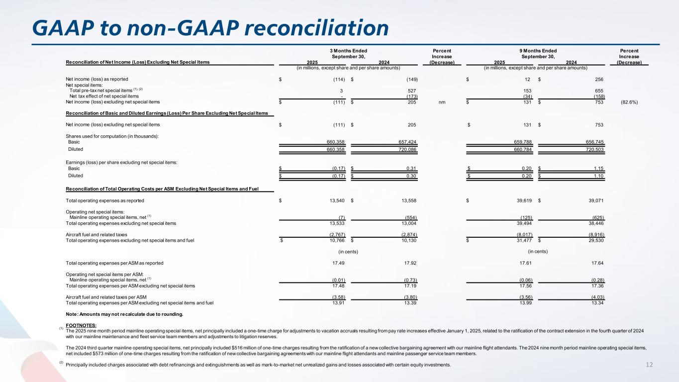 GAAP to non-GAAP reconciliation 3 Months Ended September 30, Percent Increase 9 Months Ended September 30, Percent Increase Reconciliation of Net Income (Loss) Excluding Net Special Items 2025 2024 (Decrease) 2025 2024 (Decrease) (in millions, except share and per share amounts) (in millions, except share and per share amounts) Net income (loss) as reported $ (114) $ (149) $ 12 $ 256 Net special items: Total pre-tax net special items (1), (2) 3 527 153 655 Net tax effect of net special items - (173) (34) (158) Net income (loss) excluding net special items $ (111) $ 205 nm $ 131 $ 753 (82.6%) Reconciliation of Basic and Diluted Earnings (Loss) Per Share Excluding Net Special Items Net income (loss) excluding net special items $ (111) $ 205 $ 131 $ 753 Shares used for computation (in thousands): Basic 660,358 657,424 659,788 656,745 Diluted 660,358 720,086 660,784 720,503 Earnings (loss) per share excluding net special items: Basic $ (0.17) $ 0.31 $ 0.20 $ 1.15 Diluted $ (0.17) $ 0.30 $ 0.20 $ 1.10 Reconciliation of Total Operating Costs per ASM Excluding Net Special Items and Fuel Total operating expenses as reported $ 13,540 $ 13,558 $ 39,619 $ 39,071 Operating net special items: Mainline operating special items, net (1) (7) (554) (125) (625) Total operating expenses excluding net special items 13,533 13,004 39,494 38,446 Aircraft fuel and related taxes (2,767) (2,874) (8,017) (8,916) Total operating expenses excluding net special items and fuel $ 10,766 $ 10,130 $ 31,477 $ 29,530 (in cents) (in cents) Total operating expenses per ASM as reported 17.49 17.92 17.61 17.64 Operating net special items per ASM: Mainline operating special items, net (1) (0.01) (0.73) (0.06) (0.28) Total operating expenses per ASM excluding net special items 17.48 17.19 17.56 17.36 Aircraft fuel and related taxes per ASM (3.58) (3.80) (3.56) (4.03) Total operating expenses per ASM excluding net special items and fuel 13.91 13.39 13.99 13.34 Note: Amounts may not recalculate due to rounding. FOOTNOTES: (1) The 2025 nine month period mainline operating special items, net principally included a one-time charge for adjustments to vacation accruals resulting from pay rate increases effective January 1, 2025, related to the ratification of the contract extension in the fourth quarter of 2024 with our mainline maintenance and fleet service team members and adjustments to litigation reserves. The 2024 third quarter mainline operating special items, net principally included $516 million of one-time charges resulting from the ratification of a new collective bargaining agreement with our mainline flight attendants. The 2024 nine month period mainline operating special items, net included $573 million of one-time charges resulting from the ratification of new collective bargaining agreements with our mainline flight attendants and mainline passenger service team members. (2) Principally included charges associated with debt refinancings and extinguishments as well as mark-to-market net unrealized gains and losses associated with certain equity investments. 12