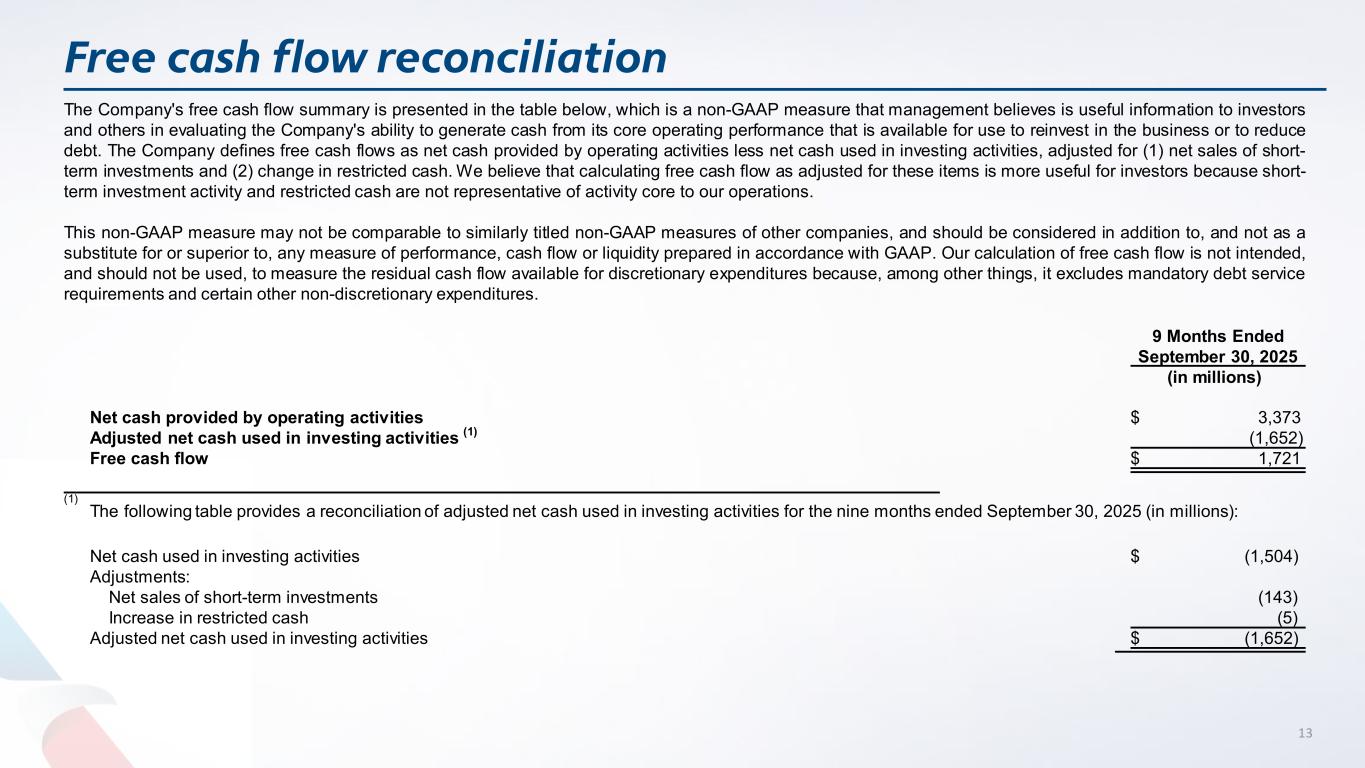 Free cash flow reconciliation The Company's free cash flow summary is presented in the table below, which is a non-GAAP measure that management believes is useful information to investors and others in evaluating the Company's ability to generate cash from its core operating performance that is available for use to reinvest in the business or to reduce debt. The Company defines free cash flows as net cash provided by operating activities less net cash used in investing activities, adjusted for (1) net sales of short- term investments and (2) change in restricted cash. We believe that calculating free cash flow as adjusted for these items is more useful for investors because short- term investment activity and restricted cash are not representative of activity core to our operations. This non-GAAP measure may not be comparable to similarly titled non-GAAP measures of other companies, and should be considered in addition to, and not as a substitute for or superior to, any measure of performance, cash flow or liquidity prepared in accordance with GAAP. Our calculation of free cash flow is not intended, and should not be used, to measure the residual cash flow available for discretionary expenditures because, among other things, it excludes mandatory debt service requirements and certain other non-discretionary expenditures. 9 Months Ended September 30, 2025 (in millions) Net cash provided by operating activities $ 3,373 Adjusted net cash used in investing activities (1) (1,652) Free cash flow $ 1,721 (1) The following table provides a reconciliation of adjusted net cash used in investing activities for the nine months ended September 30, 2025 (in millions): Net cash used in investing activities $ (1,504) Adjustments: Net sales of short-term investments (143) Increase in restricted cash (5) Adjusted net cash used in investing activities $ (1,652) 13