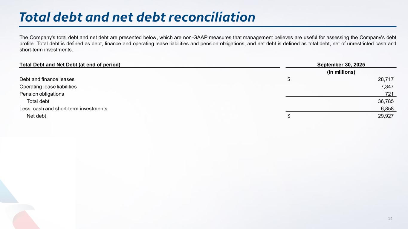 Total debt and net debt reconciliation 14 The Company's total debt and net debt are presented below, which are non-GAAP measures that management believes are useful for assessing the Company's debt profile. Total debt is defined as debt, finance and operating lease liabilities and pension obligations, and net debt is defined as total debt, net of unrestricted cash and short-term investments. Total Debt and Net Debt (at end of period) September 30, 2025 (in millions) Debt and finance leases $ 28,717 Operating lease liabilities 7,347 Pension obligations 721 Total debt 36,785 Less: cash and short-term investments 6,858 Net debt $ 29,927