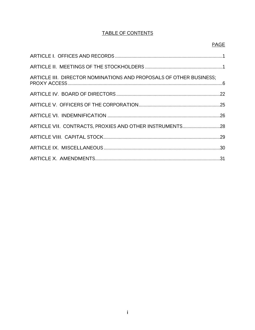 i TABLE OF CONTENTS PAGE ARTICLE I. OFFICES AND RECORDS ......................................................................................1 ARTICLE II. MEETINGS OF THE STOCKHOLDERS ..............................................................1 ARTICLE III. DIRECTOR NOMINATIONS AND PROPOSALS OF OTHER BUSINESS; PROXY ACCESS............................................................................................................................6 ARTICLE IV. BOARD OF DIRECTORS ...................................................................................22 ARTICLE V. OFFICERS OF THE CORPORATION.................................................................25 ARTICLE VI. INDEMNIFICATION ..........................................................................................26 ARTICLE VII. CONTRACTS, PROXIES AND OTHER INSTRUMENTS..............................28 ARTICLE VIII. CAPITAL STOCK.............................................................................................29 ARTICLE IX. MISCELLANEOUS .............................................................................................30 ARTICLE X. AMENDMENTS....................................................................................................31