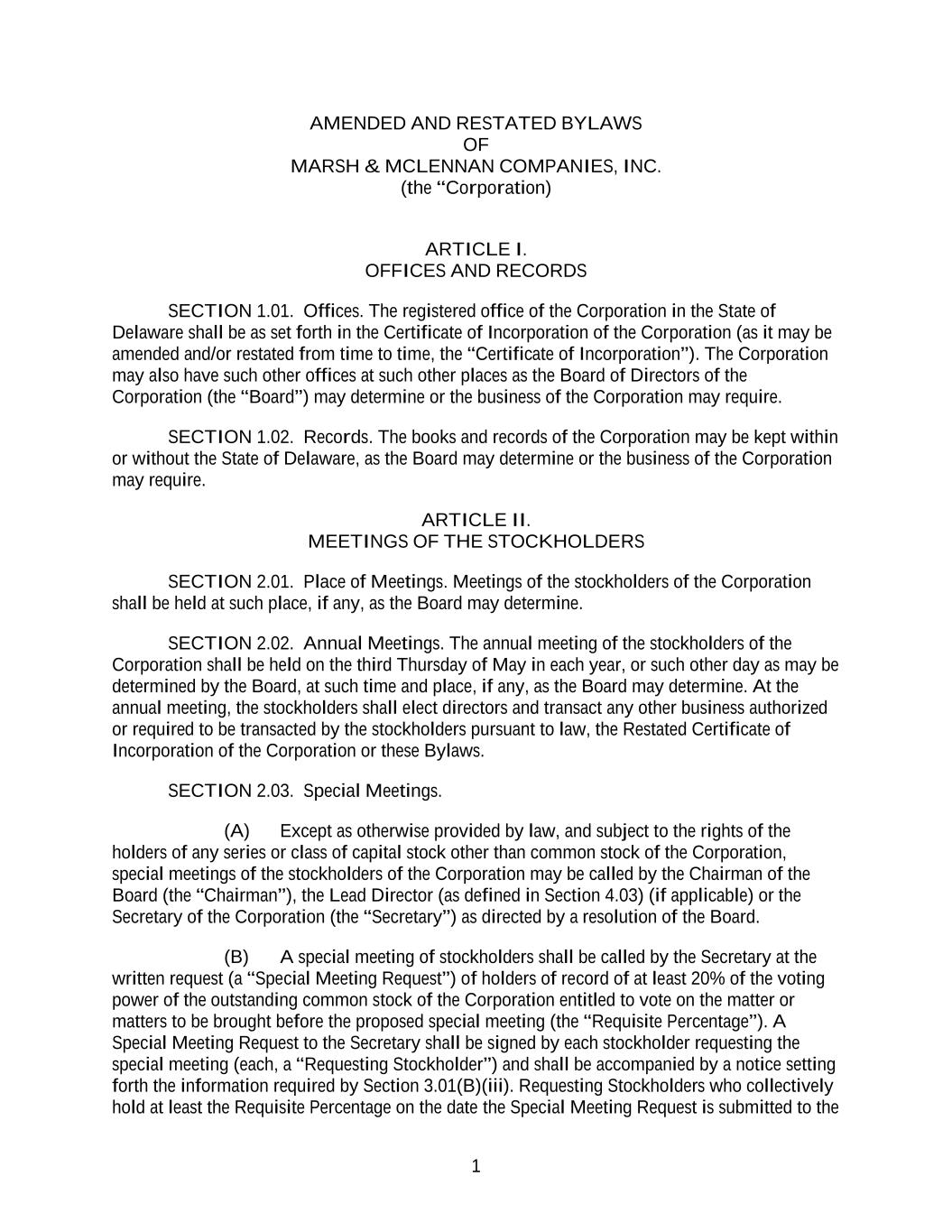 1 AMENDED AND RESTATED BYLAWS OF MARSH & MCLENNAN COMPANIES, INC. (the “Corporation) ARTICLE I. OFFICES AND RECORDS SECTION 1.01. Offices. The registered office of the Corporation in the State of Delaware shall be as set forth in the Certificate of Incorporation of the Corporation (as it may be amended and/or restated from time to time, the “Certificate of Incorporation”). The Corporation may also have such other offices at such other places as the Board of Directors of the Corporation (the “Board”) may determine or the business of the Corporation may require. SECTION 1.02. Records. The books and records of the Corporation may be kept within or without the State of Delaware, as the Board may determine or the business of the Corporation may require. ARTICLE II. MEETINGS OF THE STOCKHOLDERS SECTION 2.01. Place of Meetings. Meetings of the stockholders of the Corporation shall be held at such place, if any, as the Board may determine. SECTION 2.02. Annual Meetings. The annual meeting of the stockholders of the Corporation shall be held on the third Thursday of May in each year, or such other day as may be determined by the Board, at such time and place, if any, as the Board may determine. At the annual meeting, the stockholders shall elect directors and transact any other business authorized or required to be transacted by the stockholders pursuant to law, the Restated Certificate of Incorporation of the Corporation or these Bylaws. SECTION 2.03. Special Meetings. (A) Except as otherwise provided by law, and subject to the rights of the holders of any series or class of capital stock other than common stock of the Corporation, special meetings of the stockholders of the Corporation may be called by the Chairman of the Board (the “Chairman”), the Lead Director (as defined in Section 4.03) (if applicable) or the Secretary of the Corporation (the “Secretary”) as directed by a resolution of the Board. (B) A special meeting of stockholders shall be called by the Secretary at the written request (a “Special Meeting Request”) of holders of record of at least 20% of the voting power of the outstanding common stock of the Corporation entitled to vote on the matter or matters to be brought before the proposed special meeting (the “Requisite Percentage”). A Special Meeting Request to the Secretary shall be signed by each stockholder requesting the special meeting (each, a “Requesting Stockholder”) and shall be accompanied by a notice setting forth the information required by Section 3.01(B)(iii). Requesting Stockholders who collectively hold at least the Requisite Percentage on the date the Special Meeting Request is submitted to the