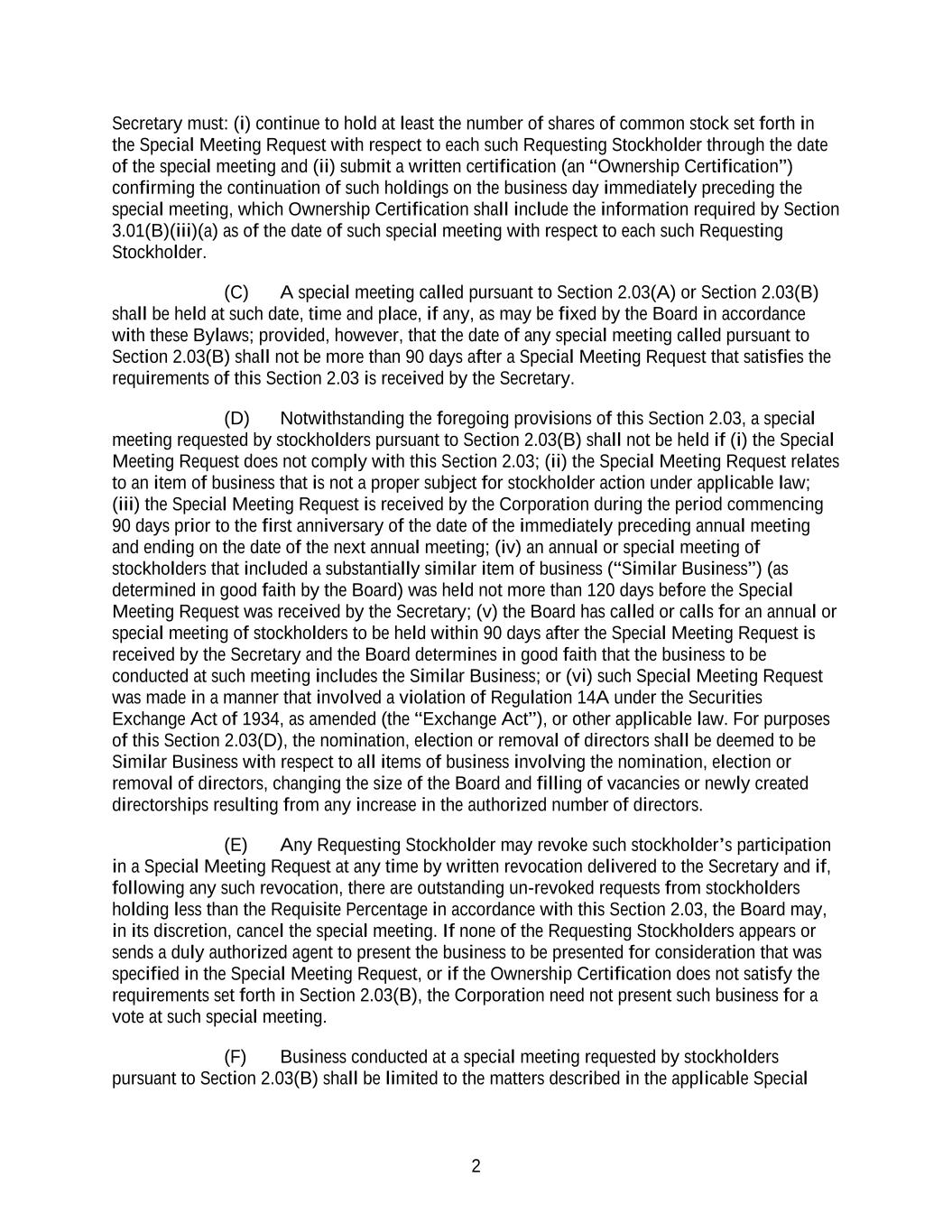 2 Secretary must: (i) continue to hold at least the number of shares of common stock set forth in the Special Meeting Request with respect to each such Requesting Stockholder through the date of the special meeting and (ii) submit a written certification (an “Ownership Certification”) confirming the continuation of such holdings on the business day immediately preceding the special meeting, which Ownership Certification shall include the information required by Section 3.01(B)(iii)(a) as of the date of such special meeting with respect to each such Requesting Stockholder. (C) A special meeting called pursuant to Section 2.03(A) or Section 2.03(B) shall be held at such date, time and place, if any, as may be fixed by the Board in accordance with these Bylaws; provided, however, that the date of any special meeting called pursuant to Section 2.03(B) shall not be more than 90 days after a Special Meeting Request that satisfies the requirements of this Section 2.03 is received by the Secretary. (D) Notwithstanding the foregoing provisions of this Section 2.03, a special meeting requested by stockholders pursuant to Section 2.03(B) shall not be held if (i) the Special Meeting Request does not comply with this Section 2.03; (ii) the Special Meeting Request relates to an item of business that is not a proper subject for stockholder action under applicable law; (iii) the Special Meeting Request is received by the Corporation during the period commencing 90 days prior to the first anniversary of the date of the immediately preceding annual meeting and ending on the date of the next annual meeting; (iv) an annual or special meeting of stockholders that included a substantially similar item of business (“Similar Business”) (as determined in good faith by the Board) was held not more than 120 days before the Special Meeting Request was received by the Secretary; (v) the Board has called or calls for an annual or special meeting of stockholders to be held within 90 days after the Special Meeting Request is received by the Secretary and the Board determines in good faith that the business to be conducted at such meeting includes the Similar Business; or (vi) such Special Meeting Request was made in a manner that involved a violation of Regulation 14A under the Securities Exchange Act of 1934, as amended (the “Exchange Act”), or other applicable law. For purposes of this Section 2.03(D), the nomination, election or removal of directors shall be deemed to be Similar Business with respect to all items of business involving the nomination, election or removal of directors, changing the size of the Board and filling of vacancies or newly created directorships resulting from any increase in the authorized number of directors. (E) Any Requesting Stockholder may revoke such stockholder’s participation in a Special Meeting Request at any time by written revocation delivered to the Secretary and if, following any such revocation, there are outstanding un-revoked requests from stockholders holding less than the Requisite Percentage in accordance with this Section 2.03, the Board may, in its discretion, cancel the special meeting. If none of the Requesting Stockholders appears or sends a duly authorized agent to present the business to be presented for consideration that was specified in the Special Meeting Request, or if the Ownership Certification does not satisfy the requirements set forth in Section 2.03(B), the Corporation need not present such business for a vote at such special meeting. (F) Business conducted at a special meeting requested by stockholders pursuant to Section 2.03(B) shall be limited to the matters described in the applicable Special