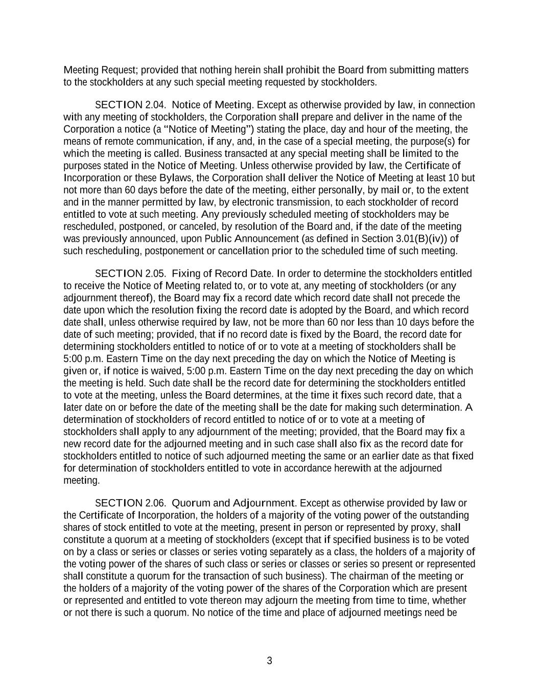 3 Meeting Request; provided that nothing herein shall prohibit the Board from submitting matters to the stockholders at any such special meeting requested by stockholders. SECTION 2.04. Notice of Meeting. Except as otherwise provided by law, in connection with any meeting of stockholders, the Corporation shall prepare and deliver in the name of the Corporation a notice (a “Notice of Meeting”) stating the place, day and hour of the meeting, the means of remote communication, if any, and, in the case of a special meeting, the purpose(s) for which the meeting is called. Business transacted at any special meeting shall be limited to the purposes stated in the Notice of Meeting. Unless otherwise provided by law, the Certificate of Incorporation or these Bylaws, the Corporation shall deliver the Notice of Meeting at least 10 but not more than 60 days before the date of the meeting, either personally, by mail or, to the extent and in the manner permitted by law, by electronic transmission, to each stockholder of record entitled to vote at such meeting. Any previously scheduled meeting of stockholders may be rescheduled, postponed, or canceled, by resolution of the Board and, if the date of the meeting was previously announced, upon Public Announcement (as defined in Section 3.01(B)(iv)) of such rescheduling, postponement or cancellation prior to the scheduled time of such meeting. SECTION 2.05. Fixing of Record Date. In order to determine the stockholders entitled to receive the Notice of Meeting related to, or to vote at, any meeting of stockholders (or any adjournment thereof), the Board may fix a record date which record date shall not precede the date upon which the resolution fixing the record date is adopted by the Board, and which record date shall, unless otherwise required by law, not be more than 60 nor less than 10 days before the date of such meeting; provided, that if no record date is fixed by the Board, the record date for determining stockholders entitled to notice of or to vote at a meeting of stockholders shall be 5:00 p.m. Eastern Time on the day next preceding the day on which the Notice of Meeting is given or, if notice is waived, 5:00 p.m. Eastern Time on the day next preceding the day on which the meeting is held. Such date shall be the record date for determining the stockholders entitled to vote at the meeting, unless the Board determines, at the time it fixes such record date, that a later date on or before the date of the meeting shall be the date for making such determination. A determination of stockholders of record entitled to notice of or to vote at a meeting of stockholders shall apply to any adjournment of the meeting; provided, that the Board may fix a new record date for the adjourned meeting and in such case shall also fix as the record date for stockholders entitled to notice of such adjourned meeting the same or an earlier date as that fixed for determination of stockholders entitled to vote in accordance herewith at the adjourned meeting. SECTION 2.06. Quorum and Adjournment. Except as otherwise provided by law or the Certificate of Incorporation, the holders of a majority of the voting power of the outstanding shares of stock entitled to vote at the meeting, present in person or represented by proxy, shall constitute a quorum at a meeting of stockholders (except that if specified business is to be voted on by a class or series or classes or series voting separately as a class, the holders of a majority of the voting power of the shares of such class or series or classes or series so present or represented shall constitute a quorum for the transaction of such business). The chairman of the meeting or the holders of a majority of the voting power of the shares of the Corporation which are present or represented and entitled to vote thereon may adjourn the meeting from time to time, whether or not there is such a quorum. No notice of the time and place of adjourned meetings need be