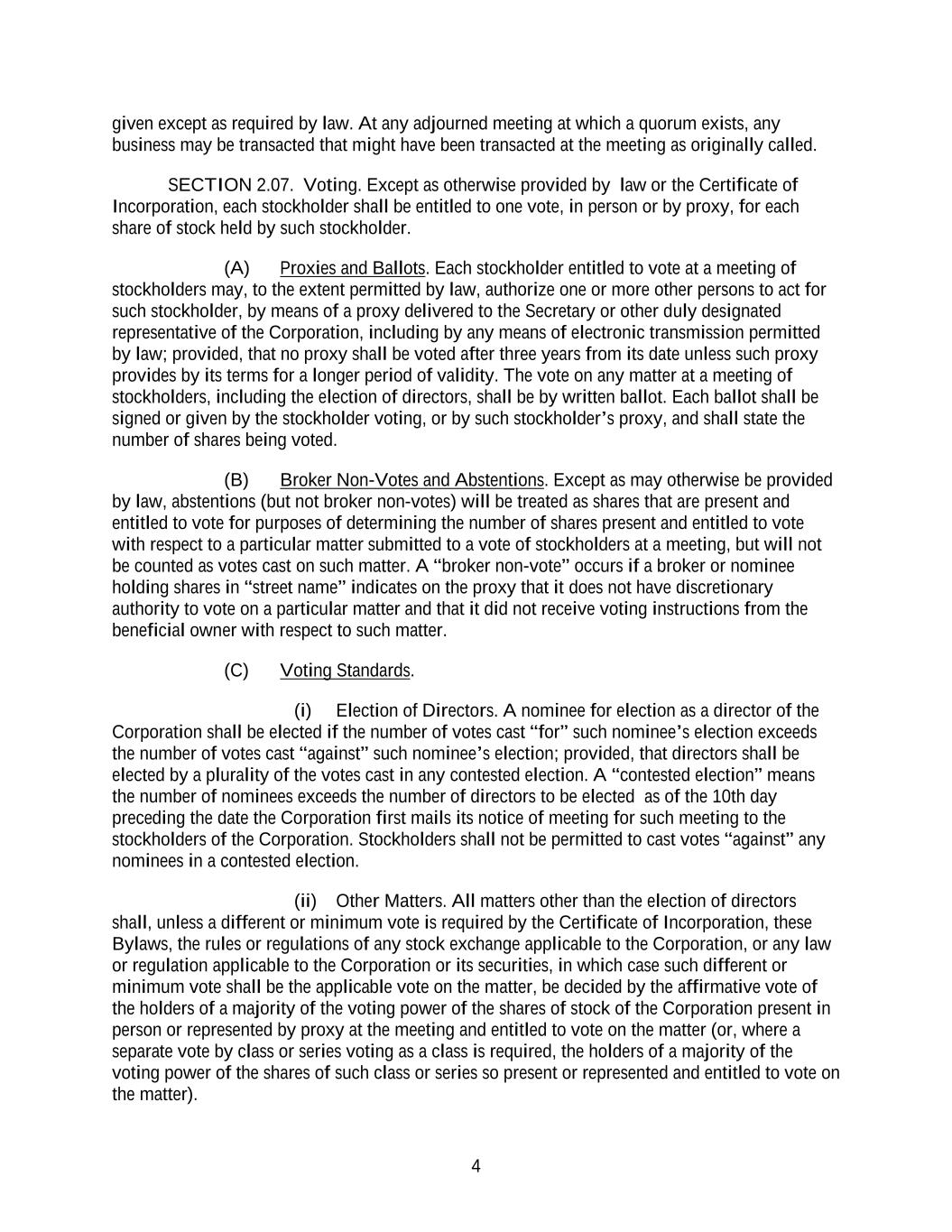 4 given except as required by law. At any adjourned meeting at which a quorum exists, any business may be transacted that might have been transacted at the meeting as originally called. SECTION 2.07. Voting. Except as otherwise provided by law or the Certificate of Incorporation, each stockholder shall be entitled to one vote, in person or by proxy, for each share of stock held by such stockholder. (A) Proxies and Ballots. Each stockholder entitled to vote at a meeting of stockholders may, to the extent permitted by law, authorize one or more other persons to act for such stockholder, by means of a proxy delivered to the Secretary or other duly designated representative of the Corporation, including by any means of electronic transmission permitted by law; provided, that no proxy shall be voted after three years from its date unless such proxy provides by its terms for a longer period of validity. The vote on any matter at a meeting of stockholders, including the election of directors, shall be by written ballot. Each ballot shall be signed or given by the stockholder voting, or by such stockholder’s proxy, and shall state the number of shares being voted. (B) Broker Non-Votes and Abstentions. Except as may otherwise be provided by law, abstentions (but not broker non-votes) will be treated as shares that are present and entitled to vote for purposes of determining the number of shares present and entitled to vote with respect to a particular matter submitted to a vote of stockholders at a meeting, but will not be counted as votes cast on such matter. A “broker non-vote” occurs if a broker or nominee holding shares in “street name” indicates on the proxy that it does not have discretionary authority to vote on a particular matter and that it did not receive voting instructions from the beneficial owner with respect to such matter. (C) Voting Standards. (i) Election of Directors. A nominee for election as a director of the Corporation shall be elected if the number of votes cast “for” such nominee’s election exceeds the number of votes cast “against” such nominee’s election; provided, that directors shall be elected by a plurality of the votes cast in any contested election. A “contested election” means the number of nominees exceeds the number of directors to be elected as of the 10th day preceding the date the Corporation first mails its notice of meeting for such meeting to the stockholders of the Corporation. Stockholders shall not be permitted to cast votes “against” any nominees in a contested election. (ii) Other Matters. All matters other than the election of directors shall, unless a different or minimum vote is required by the Certificate of Incorporation, these Bylaws, the rules or regulations of any stock exchange applicable to the Corporation, or any law or regulation applicable to the Corporation or its securities, in which case such different or minimum vote shall be the applicable vote on the matter, be decided by the affirmative vote of the holders of a majority of the voting power of the shares of stock of the Corporation present in person or represented by proxy at the meeting and entitled to vote on the matter (or, where a separate vote by class or series voting as a class is required, the holders of a majority of the voting power of the shares of such class or series so present or represented and entitled to vote on the matter).