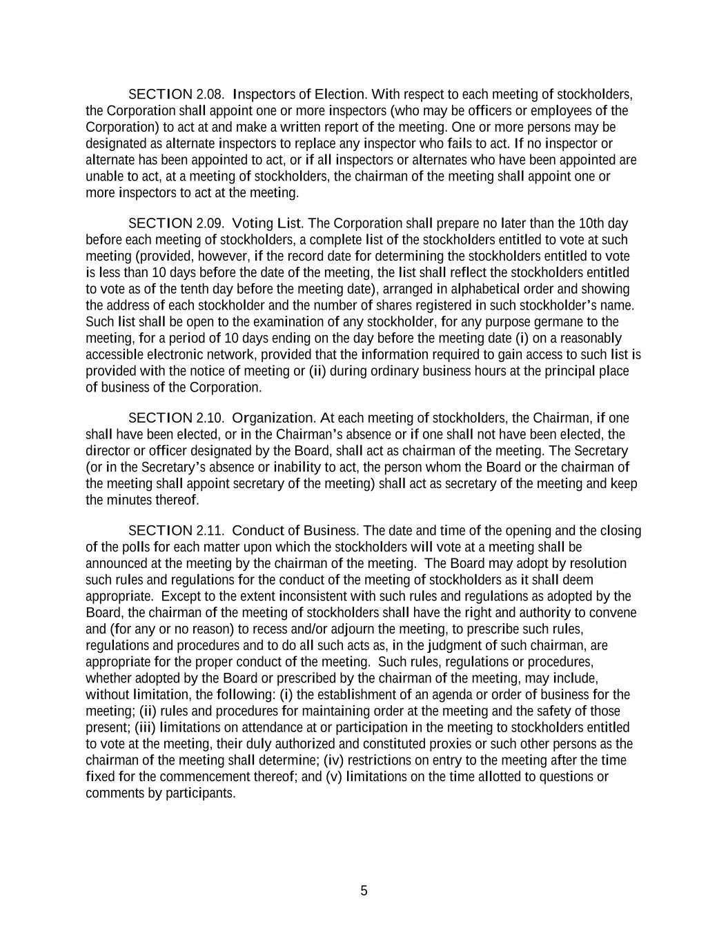 5 SECTION 2.08. Inspectors of Election. With respect to each meeting of stockholders, the Corporation shall appoint one or more inspectors (who may be officers or employees of the Corporation) to act at and make a written report of the meeting. One or more persons may be designated as alternate inspectors to replace any inspector who fails to act. If no inspector or alternate has been appointed to act, or if all inspectors or alternates who have been appointed are unable to act, at a meeting of stockholders, the chairman of the meeting shall appoint one or more inspectors to act at the meeting. SECTION 2.09. Voting List. The Corporation shall prepare no later than the 10th day before each meeting of stockholders, a complete list of the stockholders entitled to vote at such meeting (provided, however, if the record date for determining the stockholders entitled to vote is less than 10 days before the date of the meeting, the list shall reflect the stockholders entitled to vote as of the tenth day before the meeting date), arranged in alphabetical order and showing the address of each stockholder and the number of shares registered in such stockholder’s name. Such list shall be open to the examination of any stockholder, for any purpose germane to the meeting, for a period of 10 days ending on the day before the meeting date (i) on a reasonably accessible electronic network, provided that the information required to gain access to such list is provided with the notice of meeting or (ii) during ordinary business hours at the principal place of business of the Corporation. SECTION 2.10. Organization. At each meeting of stockholders, the Chairman, if one shall have been elected, or in the Chairman’s absence or if one shall not have been elected, the director or officer designated by the Board, shall act as chairman of the meeting. The Secretary (or in the Secretary’s absence or inability to act, the person whom the Board or the chairman of the meeting shall appoint secretary of the meeting) shall act as secretary of the meeting and keep the minutes thereof. SECTION 2.11. Conduct of Business. The date and time of the opening and the closing of the polls for each matter upon which the stockholders will vote at a meeting shall be announced at the meeting by the chairman of the meeting. The Board may adopt by resolution such rules and regulations for the conduct of the meeting of stockholders as it shall deem appropriate. Except to the extent inconsistent with such rules and regulations as adopted by the Board, the chairman of the meeting of stockholders shall have the right and authority to convene and (for any or no reason) to recess and/or adjourn the meeting, to prescribe such rules, regulations and procedures and to do all such acts as, in the judgment of such chairman, are appropriate for the proper conduct of the meeting. Such rules, regulations or procedures, whether adopted by the Board or prescribed by the chairman of the meeting, may include, without limitation, the following: (i) the establishment of an agenda or order of business for the meeting; (ii) rules and procedures for maintaining order at the meeting and the safety of those present; (iii) limitations on attendance at or participation in the meeting to stockholders entitled to vote at the meeting, their duly authorized and constituted proxies or such other persons as the chairman of the meeting shall determine; (iv) restrictions on entry to the meeting after the time fixed for the commencement thereof; and (v) limitations on the time allotted to questions or comments by participants.