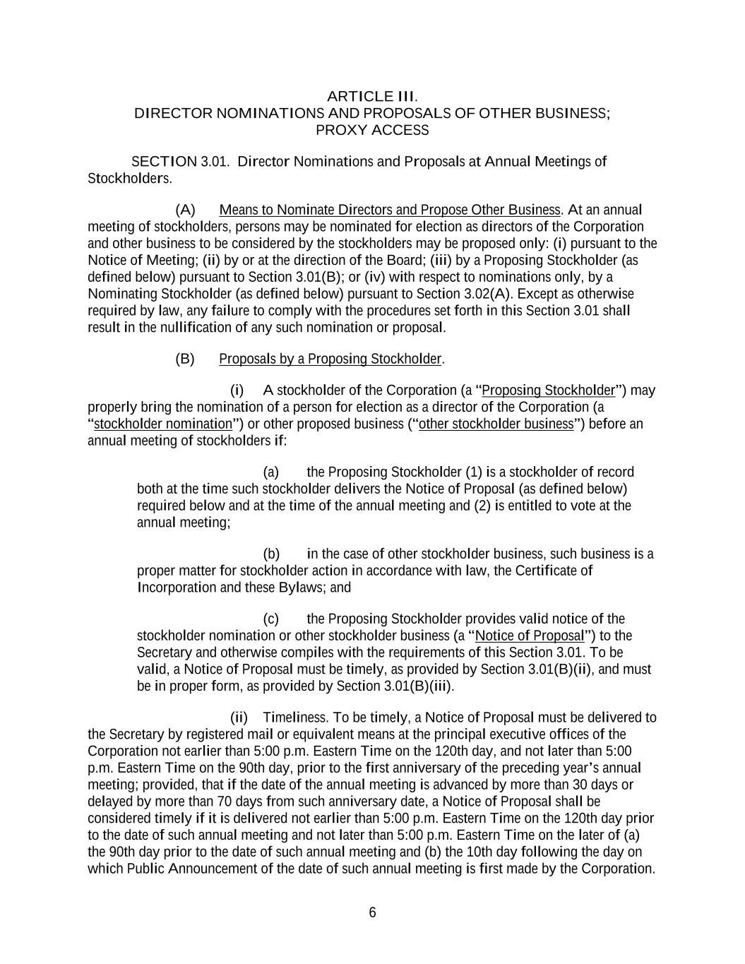 6 ARTICLE III. DIRECTOR NOMINATIONS AND PROPOSALS OF OTHER BUSINESS; PROXY ACCESS SECTION 3.01. Director Nominations and Proposals at Annual Meetings of Stockholders. (A) Means to Nominate Directors and Propose Other Business. At an annual meeting of stockholders, persons may be nominated for election as directors of the Corporation and other business to be considered by the stockholders may be proposed only: (i) pursuant to the Notice of Meeting; (ii) by or at the direction of the Board; (iii) by a Proposing Stockholder (as defined below) pursuant to Section 3.01(B); or (iv) with respect to nominations only, by a Nominating Stockholder (as defined below) pursuant to Section 3.02(A). Except as otherwise required by law, any failure to comply with the procedures set forth in this Section 3.01 shall result in the nullification of any such nomination or proposal. (B) Proposals by a Proposing Stockholder. (i) A stockholder of the Corporation (a “Proposing Stockholder”) may properly bring the nomination of a person for election as a director of the Corporation (a “stockholder nomination”) or other proposed business (“other stockholder business”) before an annual meeting of stockholders if: (a) the Proposing Stockholder (1) is a stockholder of record both at the time such stockholder delivers the Notice of Proposal (as defined below) required below and at the time of the annual meeting and (2) is entitled to vote at the annual meeting; (b) in the case of other stockholder business, such business is a proper matter for stockholder action in accordance with law, the Certificate of Incorporation and these Bylaws; and (c) the Proposing Stockholder provides valid notice of the stockholder nomination or other stockholder business (a “Notice of Proposal”) to the Secretary and otherwise compiles with the requirements of this Section 3.01. To be valid, a Notice of Proposal must be timely, as provided by Section 3.01(B)(ii), and must be in proper form, as provided by Section 3.01(B)(iii). (ii) Timeliness. To be timely, a Notice of Proposal must be delivered to the Secretary by registered mail or equivalent means at the principal executive offices of the Corporation not earlier than 5:00 p.m. Eastern Time on the 120th day, and not later than 5:00 p.m. Eastern Time on the 90th day, prior to the first anniversary of the preceding year’s annual meeting; provided, that if the date of the annual meeting is advanced by more than 30 days or delayed by more than 70 days from such anniversary date, a Notice of Proposal shall be considered timely if it is delivered not earlier than 5:00 p.m. Eastern Time on the 120th day prior to the date of such annual meeting and not later than 5:00 p.m. Eastern Time on the later of (a) the 90th day prior to the date of such annual meeting and (b) the 10th day following the day on which Public Announcement of the date of such annual meeting is first made by the Corporation.