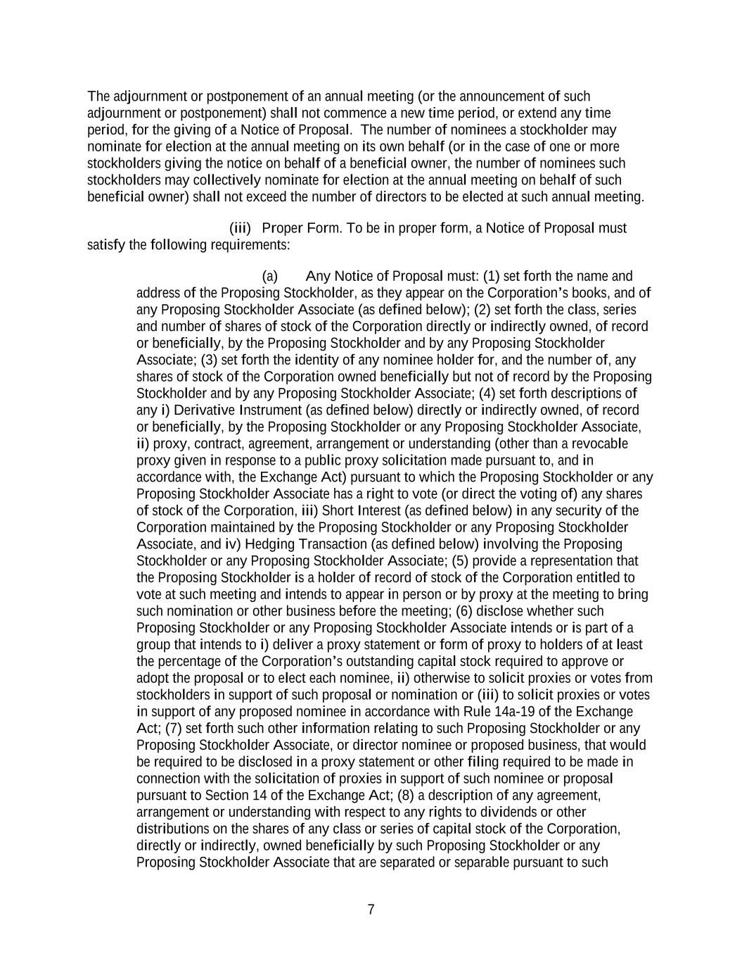 7 The adjournment or postponement of an annual meeting (or the announcement of such adjournment or postponement) shall not commence a new time period, or extend any time period, for the giving of a Notice of Proposal. The number of nominees a stockholder may nominate for election at the annual meeting on its own behalf (or in the case of one or more stockholders giving the notice on behalf of a beneficial owner, the number of nominees such stockholders may collectively nominate for election at the annual meeting on behalf of such beneficial owner) shall not exceed the number of directors to be elected at such annual meeting. (iii) Proper Form. To be in proper form, a Notice of Proposal must satisfy the following requirements: (a) Any Notice of Proposal must: (1) set forth the name and address of the Proposing Stockholder, as they appear on the Corporation’s books, and of any Proposing Stockholder Associate (as defined below); (2) set forth the class, series and number of shares of stock of the Corporation directly or indirectly owned, of record or beneficially, by the Proposing Stockholder and by any Proposing Stockholder Associate; (3) set forth the identity of any nominee holder for, and the number of, any shares of stock of the Corporation owned beneficially but not of record by the Proposing Stockholder and by any Proposing Stockholder Associate; (4) set forth descriptions of any i) Derivative Instrument (as defined below) directly or indirectly owned, of record or beneficially, by the Proposing Stockholder or any Proposing Stockholder Associate, ii) proxy, contract, agreement, arrangement or understanding (other than a revocable proxy given in response to a public proxy solicitation made pursuant to, and in accordance with, the Exchange Act) pursuant to which the Proposing Stockholder or any Proposing Stockholder Associate has a right to vote (or direct the voting of) any shares of stock of the Corporation, iii) Short Interest (as defined below) in any security of the Corporation maintained by the Proposing Stockholder or any Proposing Stockholder Associate, and iv) Hedging Transaction (as defined below) involving the Proposing Stockholder or any Proposing Stockholder Associate; (5) provide a representation that the Proposing Stockholder is a holder of record of stock of the Corporation entitled to vote at such meeting and intends to appear in person or by proxy at the meeting to bring such nomination or other business before the meeting; (6) disclose whether such Proposing Stockholder or any Proposing Stockholder Associate intends or is part of a group that intends to i) deliver a proxy statement or form of proxy to holders of at least the percentage of the Corporation’s outstanding capital stock required to approve or adopt the proposal or to elect each nominee, ii) otherwise to solicit proxies or votes from stockholders in support of such proposal or nomination or (iii) to solicit proxies or votes in support of any proposed nominee in accordance with Rule 14a-19 of the Exchange Act; (7) set forth such other information relating to such Proposing Stockholder or any Proposing Stockholder Associate, or director nominee or proposed business, that would be required to be disclosed in a proxy statement or other filing required to be made in connection with the solicitation of proxies in support of such nominee or proposal pursuant to Section 14 of the Exchange Act; (8) a description of any agreement, arrangement or understanding with respect to any rights to dividends or other distributions on the shares of any class or series of capital stock of the Corporation, directly or indirectly, owned beneficially by such Proposing Stockholder or any Proposing Stockholder Associate that are separated or separable pursuant to such