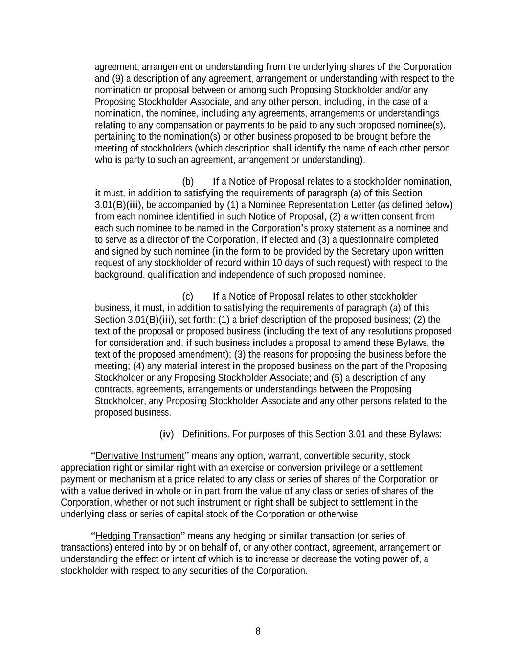 8 agreement, arrangement or understanding from the underlying shares of the Corporation and (9) a description of any agreement, arrangement or understanding with respect to the nomination or proposal between or among such Proposing Stockholder and/or any Proposing Stockholder Associate, and any other person, including, in the case of a nomination, the nominee, including any agreements, arrangements or understandings relating to any compensation or payments to be paid to any such proposed nominee(s), pertaining to the nomination(s) or other business proposed to be brought before the meeting of stockholders (which description shall identify the name of each other person who is party to such an agreement, arrangement or understanding). (b) If a Notice of Proposal relates to a stockholder nomination, it must, in addition to satisfying the requirements of paragraph (a) of this Section 3.01(B)(iii), be accompanied by (1) a Nominee Representation Letter (as defined below) from each nominee identified in such Notice of Proposal, (2) a written consent from each such nominee to be named in the Corporation’s proxy statement as a nominee and to serve as a director of the Corporation, if elected and (3) a questionnaire completed and signed by such nominee (in the form to be provided by the Secretary upon written request of any stockholder of record within 10 days of such request) with respect to the background, qualification and independence of such proposed nominee. (c) If a Notice of Proposal relates to other stockholder business, it must, in addition to satisfying the requirements of paragraph (a) of this Section 3.01(B)(iii), set forth: (1) a brief description of the proposed business; (2) the text of the proposal or proposed business (including the text of any resolutions proposed for consideration and, if such business includes a proposal to amend these Bylaws, the text of the proposed amendment); (3) the reasons for proposing the business before the meeting; (4) any material interest in the proposed business on the part of the Proposing Stockholder or any Proposing Stockholder Associate; and (5) a description of any contracts, agreements, arrangements or understandings between the Proposing Stockholder, any Proposing Stockholder Associate and any other persons related to the proposed business. (iv) Definitions. For purposes of this Section 3.01 and these Bylaws: “Derivative Instrument” means any option, warrant, convertible security, stock appreciation right or similar right with an exercise or conversion privilege or a settlement payment or mechanism at a price related to any class or series of shares of the Corporation or with a value derived in whole or in part from the value of any class or series of shares of the Corporation, whether or not such instrument or right shall be subject to settlement in the underlying class or series of capital stock of the Corporation or otherwise. “Hedging Transaction” means any hedging or similar transaction (or series of transactions) entered into by or on behalf of, or any other contract, agreement, arrangement or understanding the effect or intent of which is to increase or decrease the voting power of, a stockholder with respect to any securities of the Corporation.