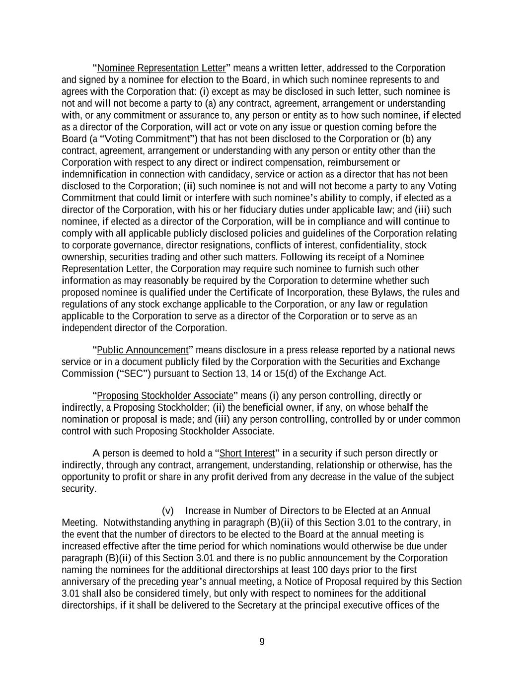 9 “Nominee Representation Letter” means a written letter, addressed to the Corporation and signed by a nominee for election to the Board, in which such nominee represents to and agrees with the Corporation that: (i) except as may be disclosed in such letter, such nominee is not and will not become a party to (a) any contract, agreement, arrangement or understanding with, or any commitment or assurance to, any person or entity as to how such nominee, if elected as a director of the Corporation, will act or vote on any issue or question coming before the Board (a “Voting Commitment”) that has not been disclosed to the Corporation or (b) any contract, agreement, arrangement or understanding with any person or entity other than the Corporation with respect to any direct or indirect compensation, reimbursement or indemnification in connection with candidacy, service or action as a director that has not been disclosed to the Corporation; (ii) such nominee is not and will not become a party to any Voting Commitment that could limit or interfere with such nominee’s ability to comply, if elected as a director of the Corporation, with his or her fiduciary duties under applicable law; and (iii) such nominee, if elected as a director of the Corporation, will be in compliance and will continue to comply with all applicable publicly disclosed policies and guidelines of the Corporation relating to corporate governance, director resignations, conflicts of interest, confidentiality, stock ownership, securities trading and other such matters. Following its receipt of a Nominee Representation Letter, the Corporation may require such nominee to furnish such other information as may reasonably be required by the Corporation to determine whether such proposed nominee is qualified under the Certificate of Incorporation, these Bylaws, the rules and regulations of any stock exchange applicable to the Corporation, or any law or regulation applicable to the Corporation to serve as a director of the Corporation or to serve as an independent director of the Corporation. “Public Announcement” means disclosure in a press release reported by a national news service or in a document publicly filed by the Corporation with the Securities and Exchange Commission (“SEC”) pursuant to Section 13, 14 or 15(d) of the Exchange Act. “Proposing Stockholder Associate” means (i) any person controlling, directly or indirectly, a Proposing Stockholder; (ii) the beneficial owner, if any, on whose behalf the nomination or proposal is made; and (iii) any person controlling, controlled by or under common control with such Proposing Stockholder Associate. A person is deemed to hold a “Short Interest” in a security if such person directly or indirectly, through any contract, arrangement, understanding, relationship or otherwise, has the opportunity to profit or share in any profit derived from any decrease in the value of the subject security. (v) Increase in Number of Directors to be Elected at an Annual Meeting. Notwithstanding anything in paragraph (B)(ii) of this Section 3.01 to the contrary, in the event that the number of directors to be elected to the Board at the annual meeting is increased effective after the time period for which nominations would otherwise be due under paragraph (B)(ii) of this Section 3.01 and there is no public announcement by the Corporation naming the nominees for the additional directorships at least 100 days prior to the first anniversary of the preceding year’s annual meeting, a Notice of Proposal required by this Section 3.01 shall also be considered timely, but only with respect to nominees for the additional directorships, if it shall be delivered to the Secretary at the principal executive offices of the