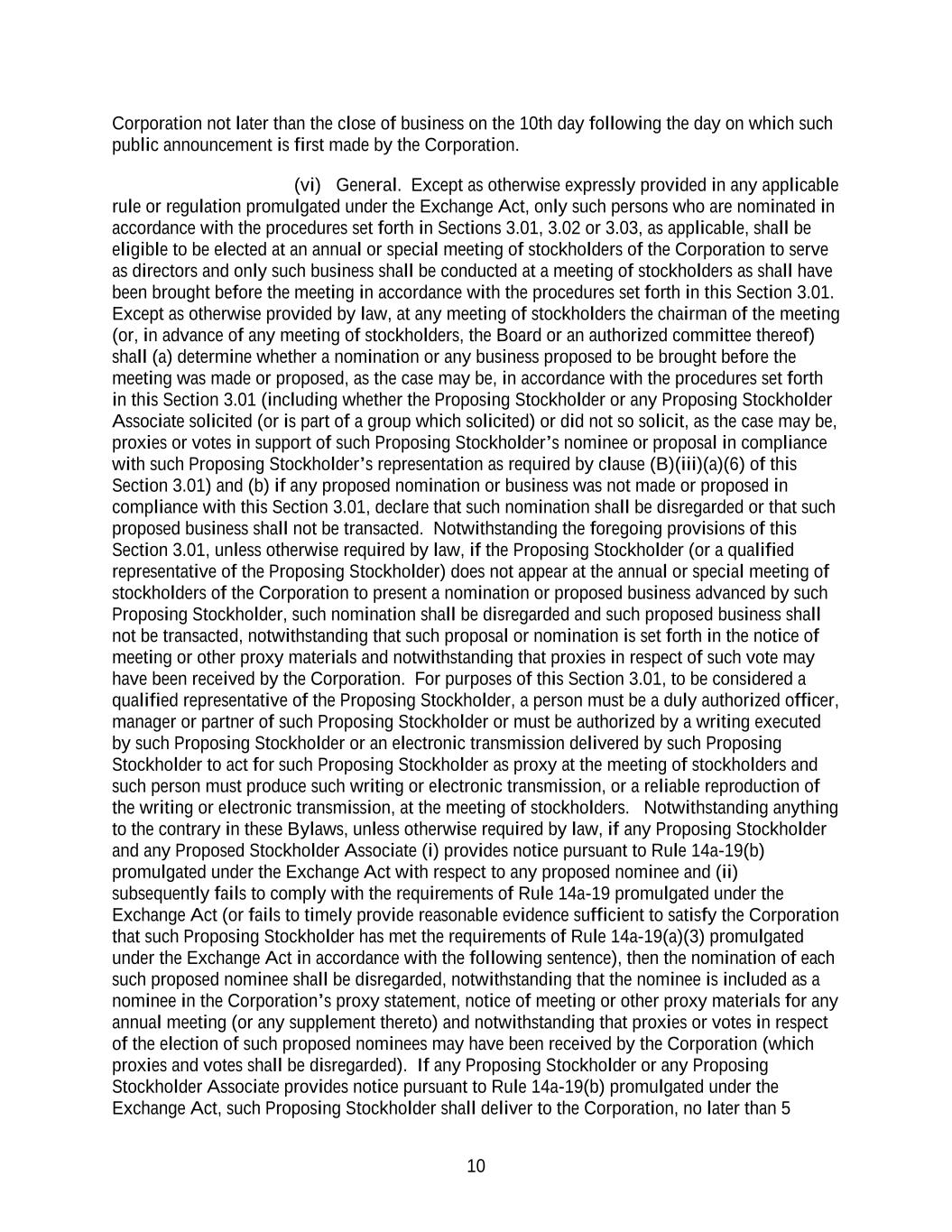 10 Corporation not later than the close of business on the 10th day following the day on which such public announcement is first made by the Corporation. (vi) General. Except as otherwise expressly provided in any applicable rule or regulation promulgated under the Exchange Act, only such persons who are nominated in accordance with the procedures set forth in Sections 3.01, 3.02 or 3.03, as applicable, shall be eligible to be elected at an annual or special meeting of stockholders of the Corporation to serve as directors and only such business shall be conducted at a meeting of stockholders as shall have been brought before the meeting in accordance with the procedures set forth in this Section 3.01. Except as otherwise provided by law, at any meeting of stockholders the chairman of the meeting (or, in advance of any meeting of stockholders, the Board or an authorized committee thereof) shall (a) determine whether a nomination or any business proposed to be brought before the meeting was made or proposed, as the case may be, in accordance with the procedures set forth in this Section 3.01 (including whether the Proposing Stockholder or any Proposing Stockholder Associate solicited (or is part of a group which solicited) or did not so solicit, as the case may be, proxies or votes in support of such Proposing Stockholder’s nominee or proposal in compliance with such Proposing Stockholder’s representation as required by clause (B)(iii)(a)(6) of this Section 3.01) and (b) if any proposed nomination or business was not made or proposed in compliance with this Section 3.01, declare that such nomination shall be disregarded or that such proposed business shall not be transacted. Notwithstanding the foregoing provisions of this Section 3.01, unless otherwise required by law, if the Proposing Stockholder (or a qualified representative of the Proposing Stockholder) does not appear at the annual or special meeting of stockholders of the Corporation to present a nomination or proposed business advanced by such Proposing Stockholder, such nomination shall be disregarded and such proposed business shall not be transacted, notwithstanding that such proposal or nomination is set forth in the notice of meeting or other proxy materials and notwithstanding that proxies in respect of such vote may have been received by the Corporation. For purposes of this Section 3.01, to be considered a qualified representative of the Proposing Stockholder, a person must be a duly authorized officer, manager or partner of such Proposing Stockholder or must be authorized by a writing executed by such Proposing Stockholder or an electronic transmission delivered by such Proposing Stockholder to act for such Proposing Stockholder as proxy at the meeting of stockholders and such person must produce such writing or electronic transmission, or a reliable reproduction of the writing or electronic transmission, at the meeting of stockholders. Notwithstanding anything to the contrary in these Bylaws, unless otherwise required by law, if any Proposing Stockholder and any Proposed Stockholder Associate (i) provides notice pursuant to Rule 14a-19(b) promulgated under the Exchange Act with respect to any proposed nominee and (ii) subsequently fails to comply with the requirements of Rule 14a-19 promulgated under the Exchange Act (or fails to timely provide reasonable evidence sufficient to satisfy the Corporation that such Proposing Stockholder has met the requirements of Rule 14a-19(a)(3) promulgated under the Exchange Act in accordance with the following sentence), then the nomination of each such proposed nominee shall be disregarded, notwithstanding that the nominee is included as a nominee in the Corporation’s proxy statement, notice of meeting or other proxy materials for any annual meeting (or any supplement thereto) and notwithstanding that proxies or votes in respect of the election of such proposed nominees may have been received by the Corporation (which proxies and votes shall be disregarded). If any Proposing Stockholder or any Proposing Stockholder Associate provides notice pursuant to Rule 14a-19(b) promulgated under the Exchange Act, such Proposing Stockholder shall deliver to the Corporation, no later than 5
