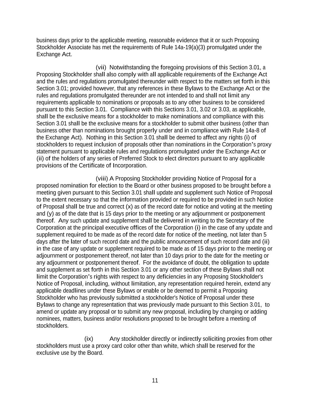 11 business days prior to the applicable meeting, reasonable evidence that it or such Proposing Stockholder Associate has met the requirements of Rule 14a-19(a)(3) promulgated under the Exchange Act. (vii) Notwithstanding the foregoing provisions of this Section 3.01, a Proposing Stockholder shall also comply with all applicable requirements of the Exchange Act and the rules and regulations promulgated thereunder with respect to the matters set forth in this Section 3.01; provided however, that any references in these Bylaws to the Exchange Act or the rules and regulations promulgated thereunder are not intended to and shall not limit any requirements applicable to nominations or proposals as to any other business to be considered pursuant to this Section 3.01. Compliance with this Sections 3.01, 3.02 or 3.03, as applicable, shall be the exclusive means for a stockholder to make nominations and compliance with this Section 3.01 shall be the exclusive means for a stockholder to submit other business (other than business other than nominations brought properly under and in compliance with Rule 14a-8 of the Exchange Act). Nothing in this Section 3.01 shall be deemed to affect any rights (i) of stockholders to request inclusion of proposals other than nominations in the Corporation’s proxy statement pursuant to applicable rules and regulations promulgated under the Exchange Act or (ii) of the holders of any series of Preferred Stock to elect directors pursuant to any applicable provisions of the Certificate of Incorporation. (viii) A Proposing Stockholder providing Notice of Proposal for a proposed nomination for election to the Board or other business proposed to be brought before a meeting given pursuant to this Section 3.01 shall update and supplement such Notice of Proposal to the extent necessary so that the information provided or required to be provided in such Notice of Proposal shall be true and correct (x) as of the record date for notice and voting at the meeting and (y) as of the date that is 15 days prior to the meeting or any adjournment or postponement thereof. Any such update and supplement shall be delivered in writing to the Secretary of the Corporation at the principal executive offices of the Corporation (i) in the case of any update and supplement required to be made as of the record date for notice of the meeting, not later than 5 days after the later of such record date and the public announcement of such record date and (ii) in the case of any update or supplement required to be made as of 15 days prior to the meeting or adjournment or postponement thereof, not later than 10 days prior to the date for the meeting or any adjournment or postponement thereof. For the avoidance of doubt, the obligation to update and supplement as set forth in this Section 3.01 or any other section of these Bylaws shall not limit the Corporation’s rights with respect to any deficiencies in any Proposing Stockholder's Notice of Proposal, including, without limitation, any representation required herein, extend any applicable deadlines under these Bylaws or enable or be deemed to permit a Proposing Stockholder who has previously submitted a stockholder's Notice of Proposal under these Bylaws to change any representation that was previously made pursuant to this Section 3.01, to amend or update any proposal or to submit any new proposal, including by changing or adding nominees, matters, business and/or resolutions proposed to be brought before a meeting of stockholders. (ix) Any stockholder directly or indirectly soliciting proxies from other stockholders must use a proxy card color other than white, which shall be reserved for the exclusive use by the Board.