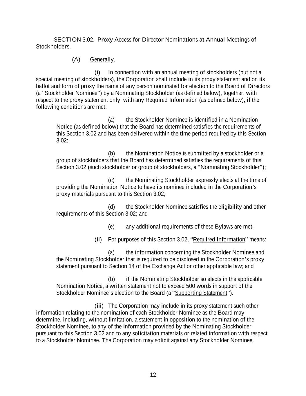 12 SECTION 3.02. Proxy Access for Director Nominations at Annual Meetings of Stockholders. (A) Generally. (i) In connection with an annual meeting of stockholders (but not a special meeting of stockholders), the Corporation shall include in its proxy statement and on its ballot and form of proxy the name of any person nominated for election to the Board of Directors (a “Stockholder Nominee”) by a Nominating Stockholder (as defined below), together, with respect to the proxy statement only, with any Required Information (as defined below), if the following conditions are met: (a) the Stockholder Nominee is identified in a Nomination Notice (as defined below) that the Board has determined satisfies the requirements of this Section 3.02 and has been delivered within the time period required by this Section 3.02; (b) the Nomination Notice is submitted by a stockholder or a group of stockholders that the Board has determined satisfies the requirements of this Section 3.02 (such stockholder or group of stockholders, a “Nominating Stockholder”); (c) the Nominating Stockholder expressly elects at the time of providing the Nomination Notice to have its nominee included in the Corporation’s proxy materials pursuant to this Section 3.02; (d) the Stockholder Nominee satisfies the eligibility and other requirements of this Section 3.02; and (e) any additional requirements of these Bylaws are met. (ii) For purposes of this Section 3.02, “Required Information” means: (a) the information concerning the Stockholder Nominee and the Nominating Stockholder that is required to be disclosed in the Corporation’s proxy statement pursuant to Section 14 of the Exchange Act or other applicable law; and (b) if the Nominating Stockholder so elects in the applicable Nomination Notice, a written statement not to exceed 500 words in support of the Stockholder Nominee’s election to the Board (a “Supporting Statement”). (iii) The Corporation may include in its proxy statement such other information relating to the nomination of each Stockholder Nominee as the Board may determine, including, without limitation, a statement in opposition to the nomination of the Stockholder Nominee, to any of the information provided by the Nominating Stockholder pursuant to this Section 3.02 and to any solicitation materials or related information with respect to a Stockholder Nominee. The Corporation may solicit against any Stockholder Nominee.
