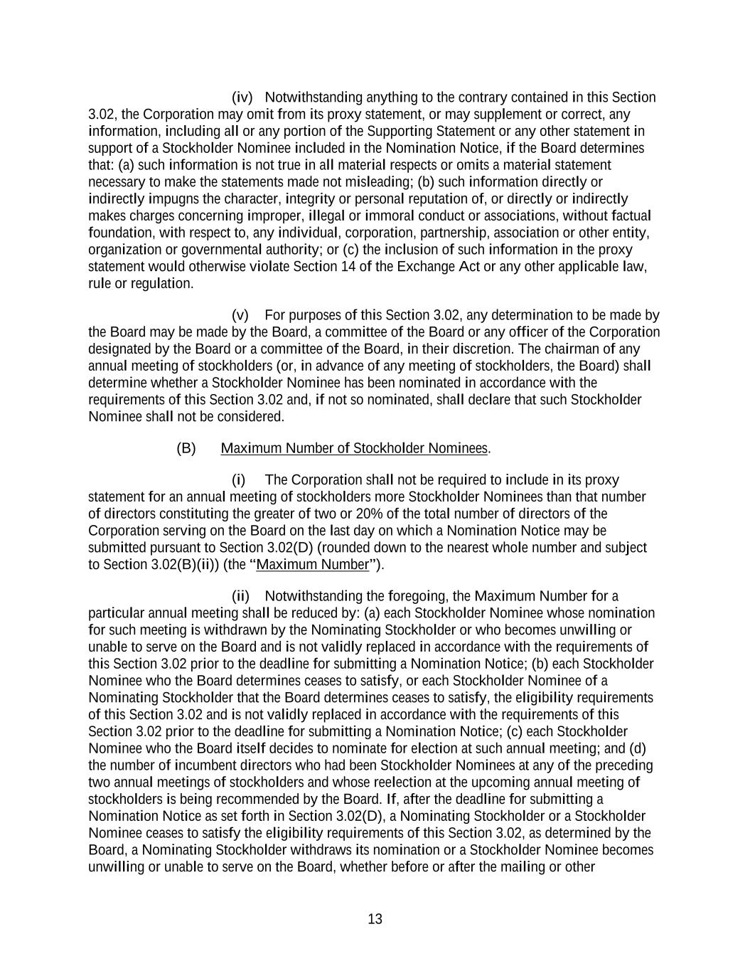 13 (iv) Notwithstanding anything to the contrary contained in this Section 3.02, the Corporation may omit from its proxy statement, or may supplement or correct, any information, including all or any portion of the Supporting Statement or any other statement in support of a Stockholder Nominee included in the Nomination Notice, if the Board determines that: (a) such information is not true in all material respects or omits a material statement necessary to make the statements made not misleading; (b) such information directly or indirectly impugns the character, integrity or personal reputation of, or directly or indirectly makes charges concerning improper, illegal or immoral conduct or associations, without factual foundation, with respect to, any individual, corporation, partnership, association or other entity, organization or governmental authority; or (c) the inclusion of such information in the proxy statement would otherwise violate Section 14 of the Exchange Act or any other applicable law, rule or regulation. (v) For purposes of this Section 3.02, any determination to be made by the Board may be made by the Board, a committee of the Board or any officer of the Corporation designated by the Board or a committee of the Board, in their discretion. The chairman of any annual meeting of stockholders (or, in advance of any meeting of stockholders, the Board) shall determine whether a Stockholder Nominee has been nominated in accordance with the requirements of this Section 3.02 and, if not so nominated, shall declare that such Stockholder Nominee shall not be considered. (B) Maximum Number of Stockholder Nominees. (i) The Corporation shall not be required to include in its proxy statement for an annual meeting of stockholders more Stockholder Nominees than that number of directors constituting the greater of two or 20% of the total number of directors of the Corporation serving on the Board on the last day on which a Nomination Notice may be submitted pursuant to Section 3.02(D) (rounded down to the nearest whole number and subject to Section 3.02(B)(ii)) (the “Maximum Number”). (ii) Notwithstanding the foregoing, the Maximum Number for a particular annual meeting shall be reduced by: (a) each Stockholder Nominee whose nomination for such meeting is withdrawn by the Nominating Stockholder or who becomes unwilling or unable to serve on the Board and is not validly replaced in accordance with the requirements of this Section 3.02 prior to the deadline for submitting a Nomination Notice; (b) each Stockholder Nominee who the Board determines ceases to satisfy, or each Stockholder Nominee of a Nominating Stockholder that the Board determines ceases to satisfy, the eligibility requirements of this Section 3.02 and is not validly replaced in accordance with the requirements of this Section 3.02 prior to the deadline for submitting a Nomination Notice; (c) each Stockholder Nominee who the Board itself decides to nominate for election at such annual meeting; and (d) the number of incumbent directors who had been Stockholder Nominees at any of the preceding two annual meetings of stockholders and whose reelection at the upcoming annual meeting of stockholders is being recommended by the Board. If, after the deadline for submitting a Nomination Notice as set forth in Section 3.02(D), a Nominating Stockholder or a Stockholder Nominee ceases to satisfy the eligibility requirements of this Section 3.02, as determined by the Board, a Nominating Stockholder withdraws its nomination or a Stockholder Nominee becomes unwilling or unable to serve on the Board, whether before or after the mailing or other