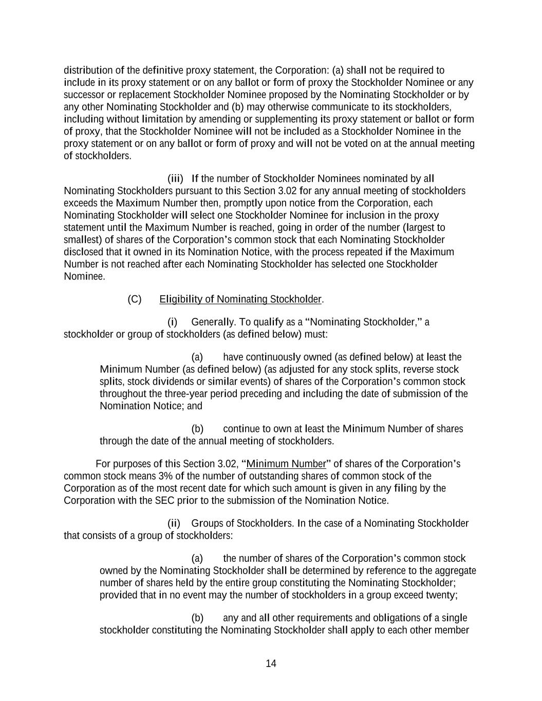 14 distribution of the definitive proxy statement, the Corporation: (a) shall not be required to include in its proxy statement or on any ballot or form of proxy the Stockholder Nominee or any successor or replacement Stockholder Nominee proposed by the Nominating Stockholder or by any other Nominating Stockholder and (b) may otherwise communicate to its stockholders, including without limitation by amending or supplementing its proxy statement or ballot or form of proxy, that the Stockholder Nominee will not be included as a Stockholder Nominee in the proxy statement or on any ballot or form of proxy and will not be voted on at the annual meeting of stockholders. (iii) If the number of Stockholder Nominees nominated by all Nominating Stockholders pursuant to this Section 3.02 for any annual meeting of stockholders exceeds the Maximum Number then, promptly upon notice from the Corporation, each Nominating Stockholder will select one Stockholder Nominee for inclusion in the proxy statement until the Maximum Number is reached, going in order of the number (largest to smallest) of shares of the Corporation’s common stock that each Nominating Stockholder disclosed that it owned in its Nomination Notice, with the process repeated if the Maximum Number is not reached after each Nominating Stockholder has selected one Stockholder Nominee. (C) Eligibility of Nominating Stockholder. (i) Generally. To qualify as a “Nominating Stockholder,” a stockholder or group of stockholders (as defined below) must: (a) have continuously owned (as defined below) at least the Minimum Number (as defined below) (as adjusted for any stock splits, reverse stock splits, stock dividends or similar events) of shares of the Corporation’s common stock throughout the three-year period preceding and including the date of submission of the Nomination Notice; and (b) continue to own at least the Minimum Number of shares through the date of the annual meeting of stockholders. For purposes of this Section 3.02, “Minimum Number” of shares of the Corporation’s common stock means 3% of the number of outstanding shares of common stock of the Corporation as of the most recent date for which such amount is given in any filing by the Corporation with the SEC prior to the submission of the Nomination Notice. (ii) Groups of Stockholders. In the case of a Nominating Stockholder that consists of a group of stockholders: (a) the number of shares of the Corporation’s common stock owned by the Nominating Stockholder shall be determined by reference to the aggregate number of shares held by the entire group constituting the Nominating Stockholder; provided that in no event may the number of stockholders in a group exceed twenty; (b) any and all other requirements and obligations of a single stockholder constituting the Nominating Stockholder shall apply to each other member