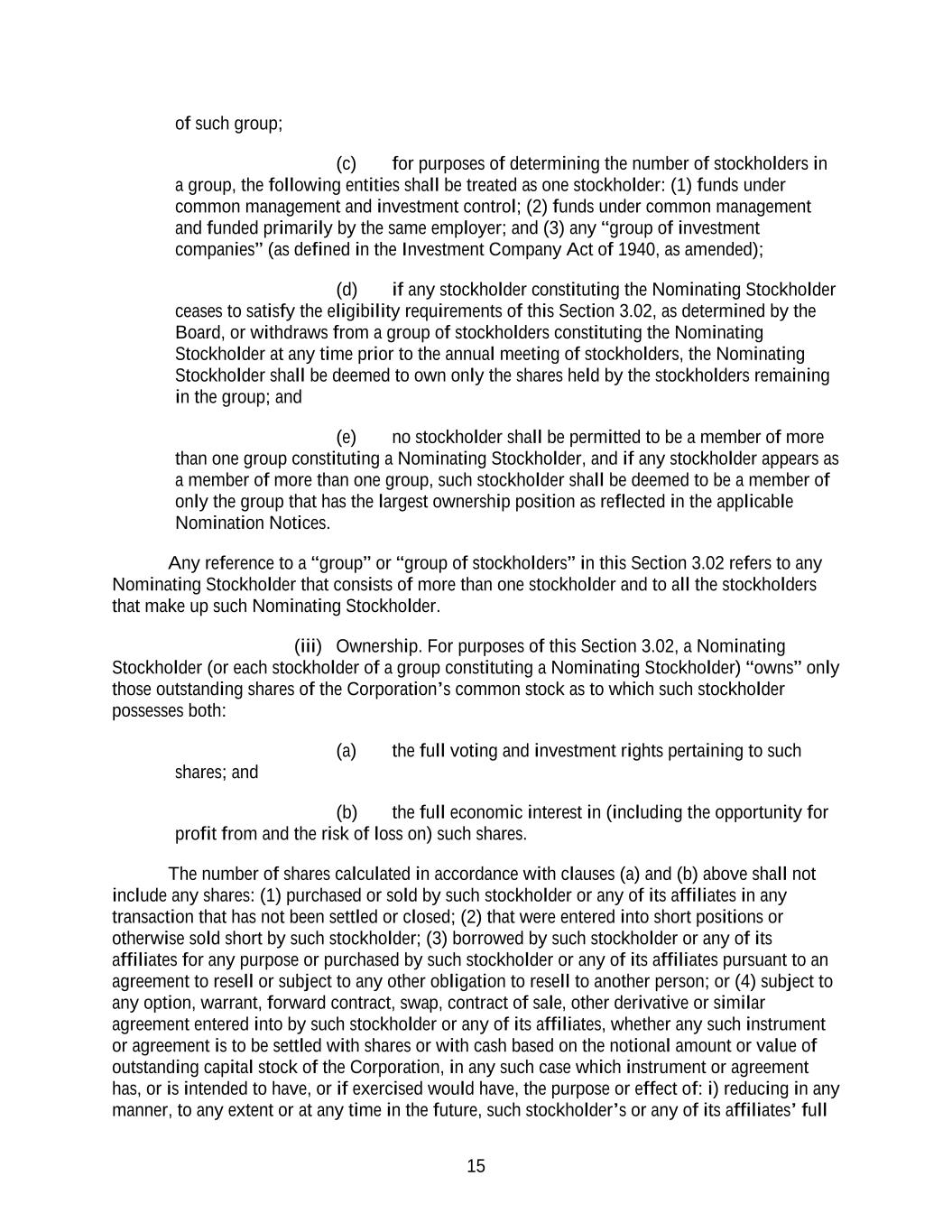 15 of such group; (c) for purposes of determining the number of stockholders in a group, the following entities shall be treated as one stockholder: (1) funds under common management and investment control; (2) funds under common management and funded primarily by the same employer; and (3) any “group of investment companies” (as defined in the Investment Company Act of 1940, as amended); (d) if any stockholder constituting the Nominating Stockholder ceases to satisfy the eligibility requirements of this Section 3.02, as determined by the Board, or withdraws from a group of stockholders constituting the Nominating Stockholder at any time prior to the annual meeting of stockholders, the Nominating Stockholder shall be deemed to own only the shares held by the stockholders remaining in the group; and (e) no stockholder shall be permitted to be a member of more than one group constituting a Nominating Stockholder, and if any stockholder appears as a member of more than one group, such stockholder shall be deemed to be a member of only the group that has the largest ownership position as reflected in the applicable Nomination Notices. Any reference to a “group” or “group of stockholders” in this Section 3.02 refers to any Nominating Stockholder that consists of more than one stockholder and to all the stockholders that make up such Nominating Stockholder. (iii) Ownership. For purposes of this Section 3.02, a Nominating Stockholder (or each stockholder of a group constituting a Nominating Stockholder) “owns” only those outstanding shares of the Corporation’s common stock as to which such stockholder possesses both: (a) the full voting and investment rights pertaining to such shares; and (b) the full economic interest in (including the opportunity for profit from and the risk of loss on) such shares. The number of shares calculated in accordance with clauses (a) and (b) above shall not include any shares: (1) purchased or sold by such stockholder or any of its affiliates in any transaction that has not been settled or closed; (2) that were entered into short positions or otherwise sold short by such stockholder; (3) borrowed by such stockholder or any of its affiliates for any purpose or purchased by such stockholder or any of its affiliates pursuant to an agreement to resell or subject to any other obligation to resell to another person; or (4) subject to any option, warrant, forward contract, swap, contract of sale, other derivative or similar agreement entered into by such stockholder or any of its affiliates, whether any such instrument or agreement is to be settled with shares or with cash based on the notional amount or value of outstanding capital stock of the Corporation, in any such case which instrument or agreement has, or is intended to have, or if exercised would have, the purpose or effect of: i) reducing in any manner, to any extent or at any time in the future, such stockholder’s or any of its affiliates’ full