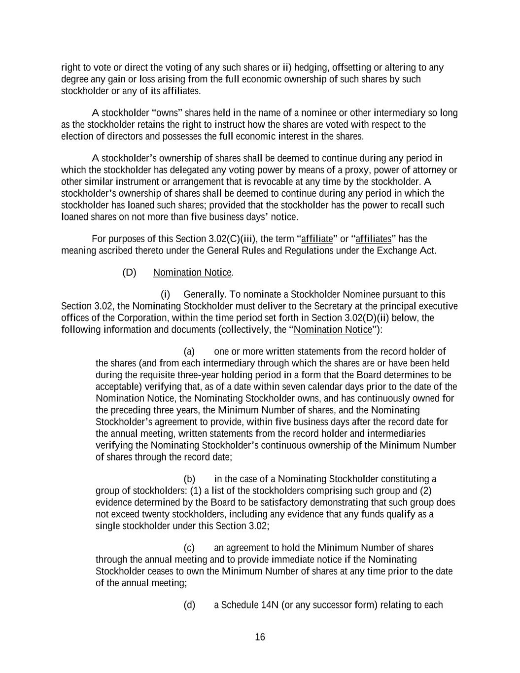 16 right to vote or direct the voting of any such shares or ii) hedging, offsetting or altering to any degree any gain or loss arising from the full economic ownership of such shares by such stockholder or any of its affiliates. A stockholder “owns” shares held in the name of a nominee or other intermediary so long as the stockholder retains the right to instruct how the shares are voted with respect to the election of directors and possesses the full economic interest in the shares. A stockholder’s ownership of shares shall be deemed to continue during any period in which the stockholder has delegated any voting power by means of a proxy, power of attorney or other similar instrument or arrangement that is revocable at any time by the stockholder. A stockholder’s ownership of shares shall be deemed to continue during any period in which the stockholder has loaned such shares; provided that the stockholder has the power to recall such loaned shares on not more than five business days’ notice. For purposes of this Section 3.02(C)(iii), the term “affiliate” or “affiliates” has the meaning ascribed thereto under the General Rules and Regulations under the Exchange Act. (D) Nomination Notice. (i) Generally. To nominate a Stockholder Nominee pursuant to this Section 3.02, the Nominating Stockholder must deliver to the Secretary at the principal executive offices of the Corporation, within the time period set forth in Section 3.02(D)(ii) below, the following information and documents (collectively, the “Nomination Notice”): (a) one or more written statements from the record holder of the shares (and from each intermediary through which the shares are or have been held during the requisite three-year holding period in a form that the Board determines to be acceptable) verifying that, as of a date within seven calendar days prior to the date of the Nomination Notice, the Nominating Stockholder owns, and has continuously owned for the preceding three years, the Minimum Number of shares, and the Nominating Stockholder’s agreement to provide, within five business days after the record date for the annual meeting, written statements from the record holder and intermediaries verifying the Nominating Stockholder’s continuous ownership of the Minimum Number of shares through the record date; (b) in the case of a Nominating Stockholder constituting a group of stockholders: (1) a list of the stockholders comprising such group and (2) evidence determined by the Board to be satisfactory demonstrating that such group does not exceed twenty stockholders, including any evidence that any funds qualify as a single stockholder under this Section 3.02; (c) an agreement to hold the Minimum Number of shares through the annual meeting and to provide immediate notice if the Nominating Stockholder ceases to own the Minimum Number of shares at any time prior to the date of the annual meeting; (d) a Schedule 14N (or any successor form) relating to each