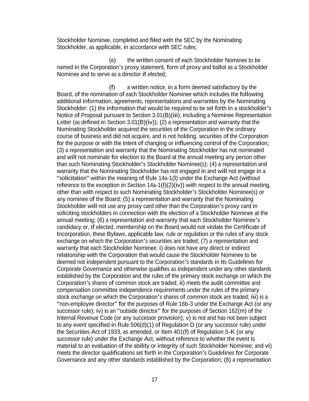 17 Stockholder Nominee, completed and filed with the SEC by the Nominating Stockholder, as applicable, in accordance with SEC rules; (e) the written consent of each Stockholder Nominee to be named in the Corporation’s proxy statement, form of proxy and ballot as a Stockholder Nominee and to serve as a director if elected; (f) a written notice, in a form deemed satisfactory by the Board, of the nomination of each Stockholder Nominee which includes the following additional information, agreements, representations and warranties by the Nominating Stockholder: (1) the information that would be required to be set forth in a stockholder’s Notice of Proposal pursuant to Section 3.01(B)(iii), including a Nominee Representation Letter (as defined in Section 3.01(B)(iv)); (2) a representation and warranty that the Nominating Stockholder acquired the securities of the Corporation in the ordinary course of business and did not acquire, and is not holding, securities of the Corporation for the purpose or with the intent of changing or influencing control of the Corporation; (3) a representation and warranty that the Nominating Stockholder has not nominated and will not nominate for election to the Board at the annual meeting any person other than such Nominating Stockholder’s Stockholder Nominee(s); (4) a representation and warranty that the Nominating Stockholder has not engaged in and will not engage in a “solicitation” within the meaning of Rule 14a-1(l) under the Exchange Act (without reference to the exception in Section 14a-1(l)(2)(iv)) with respect to the annual meeting, other than with respect to such Nominating Stockholder’s Stockholder Nominee(s) or any nominee of the Board; (5) a representation and warranty that the Nominating Stockholder will not use any proxy card other than the Corporation’s proxy card in soliciting stockholders in connection with the election of a Stockholder Nominee at the annual meeting; (6) a representation and warranty that each Stockholder Nominee’s candidacy or, if elected, membership on the Board would not violate the Certificate of Incorporation, these Bylaws, applicable law, rule or regulation or the rules of any stock exchange on which the Corporation’s securities are traded; (7) a representation and warranty that each Stockholder Nominee: i) does not have any direct or indirect relationship with the Corporation that would cause the Stockholder Nominee to be deemed not independent pursuant to the Corporation’s standards in its Guidelines for Corporate Governance and otherwise qualifies as independent under any other standards established by the Corporation and the rules of the primary stock exchange on which the Corporation’s shares of common stock are traded; ii) meets the audit committee and compensation committee independence requirements under the rules of the primary stock exchange on which the Corporation’s shares of common stock are traded; iii) is a “non-employee director” for the purposes of Rule 16b-3 under the Exchange Act (or any successor rule); iv) is an “outside director” for the purposes of Section 162(m) of the Internal Revenue Code (or any successor provision); v) is not and has not been subject to any event specified in Rule 506(d)(1) of Regulation D (or any successor rule) under the Securities Act of 1933, as amended, or Item 401(f) of Regulation S-K (or any successor rule) under the Exchange Act, without reference to whether the event is material to an evaluation of the ability or integrity of such Stockholder Nominee; and vi) meets the director qualifications set forth in the Corporation’s Guidelines for Corporate Governance and any other standards established by the Corporation; (8) a representation