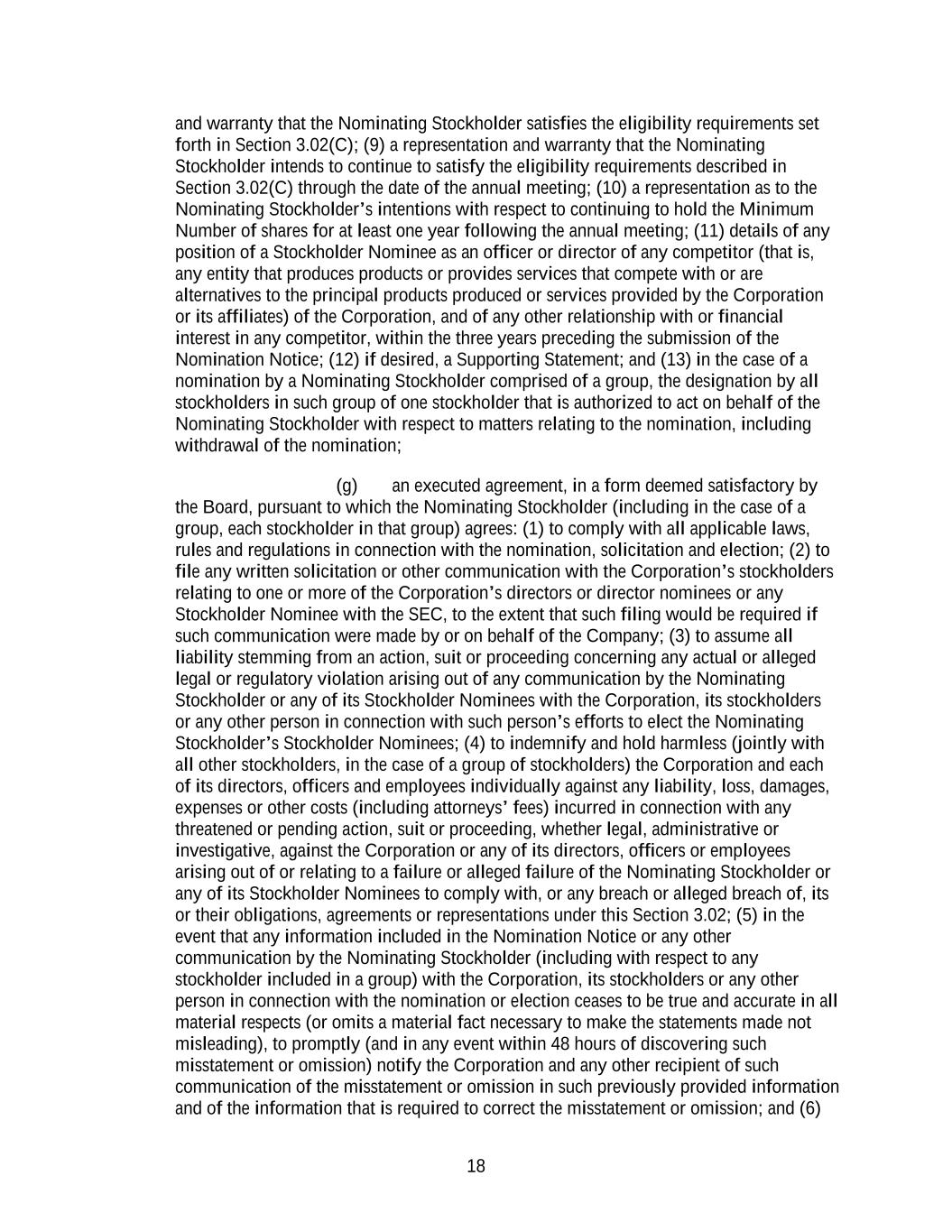 18 and warranty that the Nominating Stockholder satisfies the eligibility requirements set forth in Section 3.02(C); (9) a representation and warranty that the Nominating Stockholder intends to continue to satisfy the eligibility requirements described in Section 3.02(C) through the date of the annual meeting; (10) a representation as to the Nominating Stockholder’s intentions with respect to continuing to hold the Minimum Number of shares for at least one year following the annual meeting; (11) details of any position of a Stockholder Nominee as an officer or director of any competitor (that is, any entity that produces products or provides services that compete with or are alternatives to the principal products produced or services provided by the Corporation or its affiliates) of the Corporation, and of any other relationship with or financial interest in any competitor, within the three years preceding the submission of the Nomination Notice; (12) if desired, a Supporting Statement; and (13) in the case of a nomination by a Nominating Stockholder comprised of a group, the designation by all stockholders in such group of one stockholder that is authorized to act on behalf of the Nominating Stockholder with respect to matters relating to the nomination, including withdrawal of the nomination; (g) an executed agreement, in a form deemed satisfactory by the Board, pursuant to which the Nominating Stockholder (including in the case of a group, each stockholder in that group) agrees: (1) to comply with all applicable laws, rules and regulations in connection with the nomination, solicitation and election; (2) to file any written solicitation or other communication with the Corporation’s stockholders relating to one or more of the Corporation’s directors or director nominees or any Stockholder Nominee with the SEC, to the extent that such filing would be required if such communication were made by or on behalf of the Company; (3) to assume all liability stemming from an action, suit or proceeding concerning any actual or alleged legal or regulatory violation arising out of any communication by the Nominating Stockholder or any of its Stockholder Nominees with the Corporation, its stockholders or any other person in connection with such person’s efforts to elect the Nominating Stockholder’s Stockholder Nominees; (4) to indemnify and hold harmless (jointly with all other stockholders, in the case of a group of stockholders) the Corporation and each of its directors, officers and employees individually against any liability, loss, damages, expenses or other costs (including attorneys’ fees) incurred in connection with any threatened or pending action, suit or proceeding, whether legal, administrative or investigative, against the Corporation or any of its directors, officers or employees arising out of or relating to a failure or alleged failure of the Nominating Stockholder or any of its Stockholder Nominees to comply with, or any breach or alleged breach of, its or their obligations, agreements or representations under this Section 3.02; (5) in the event that any information included in the Nomination Notice or any other communication by the Nominating Stockholder (including with respect to any stockholder included in a group) with the Corporation, its stockholders or any other person in connection with the nomination or election ceases to be true and accurate in all material respects (or omits a material fact necessary to make the statements made not misleading), to promptly (and in any event within 48 hours of discovering such misstatement or omission) notify the Corporation and any other recipient of such communication of the misstatement or omission in such previously provided information and of the information that is required to correct the misstatement or omission; and (6)