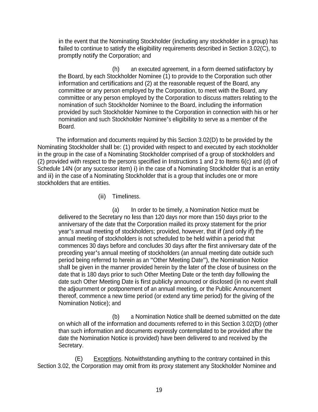 19 in the event that the Nominating Stockholder (including any stockholder in a group) has failed to continue to satisfy the eligibility requirements described in Section 3.02(C), to promptly notify the Corporation; and (h) an executed agreement, in a form deemed satisfactory by the Board, by each Stockholder Nominee (1) to provide to the Corporation such other information and certifications and (2) at the reasonable request of the Board, any committee or any person employed by the Corporation, to meet with the Board, any committee or any person employed by the Corporation to discuss matters relating to the nomination of such Stockholder Nominee to the Board, including the information provided by such Stockholder Nominee to the Corporation in connection with his or her nomination and such Stockholder Nominee’s eligibility to serve as a member of the Board. The information and documents required by this Section 3.02(D) to be provided by the Nominating Stockholder shall be: (1) provided with respect to and executed by each stockholder in the group in the case of a Nominating Stockholder comprised of a group of stockholders and (2) provided with respect to the persons specified in Instructions 1 and 2 to Items 6(c) and (d) of Schedule 14N (or any successor item) i) in the case of a Nominating Stockholder that is an entity and ii) in the case of a Nominating Stockholder that is a group that includes one or more stockholders that are entities. (ii) Timeliness. (a) In order to be timely, a Nomination Notice must be delivered to the Secretary no less than 120 days nor more than 150 days prior to the anniversary of the date that the Corporation mailed its proxy statement for the prior year’s annual meeting of stockholders; provided, however, that if (and only if) the annual meeting of stockholders is not scheduled to be held within a period that commences 30 days before and concludes 30 days after the first anniversary date of the preceding year’s annual meeting of stockholders (an annual meeting date outside such period being referred to herein as an “Other Meeting Date”), the Nomination Notice shall be given in the manner provided herein by the later of the close of business on the date that is 180 days prior to such Other Meeting Date or the tenth day following the date such Other Meeting Date is first publicly announced or disclosed (in no event shall the adjournment or postponement of an annual meeting, or the Public Announcement thereof, commence a new time period (or extend any time period) for the giving of the Nomination Notice); and (b) a Nomination Notice shall be deemed submitted on the date on which all of the information and documents referred to in this Section 3.02(D) (other than such information and documents expressly contemplated to be provided after the date the Nomination Notice is provided) have been delivered to and received by the Secretary. (E) Exceptions. Notwithstanding anything to the contrary contained in this Section 3.02, the Corporation may omit from its proxy statement any Stockholder Nominee and