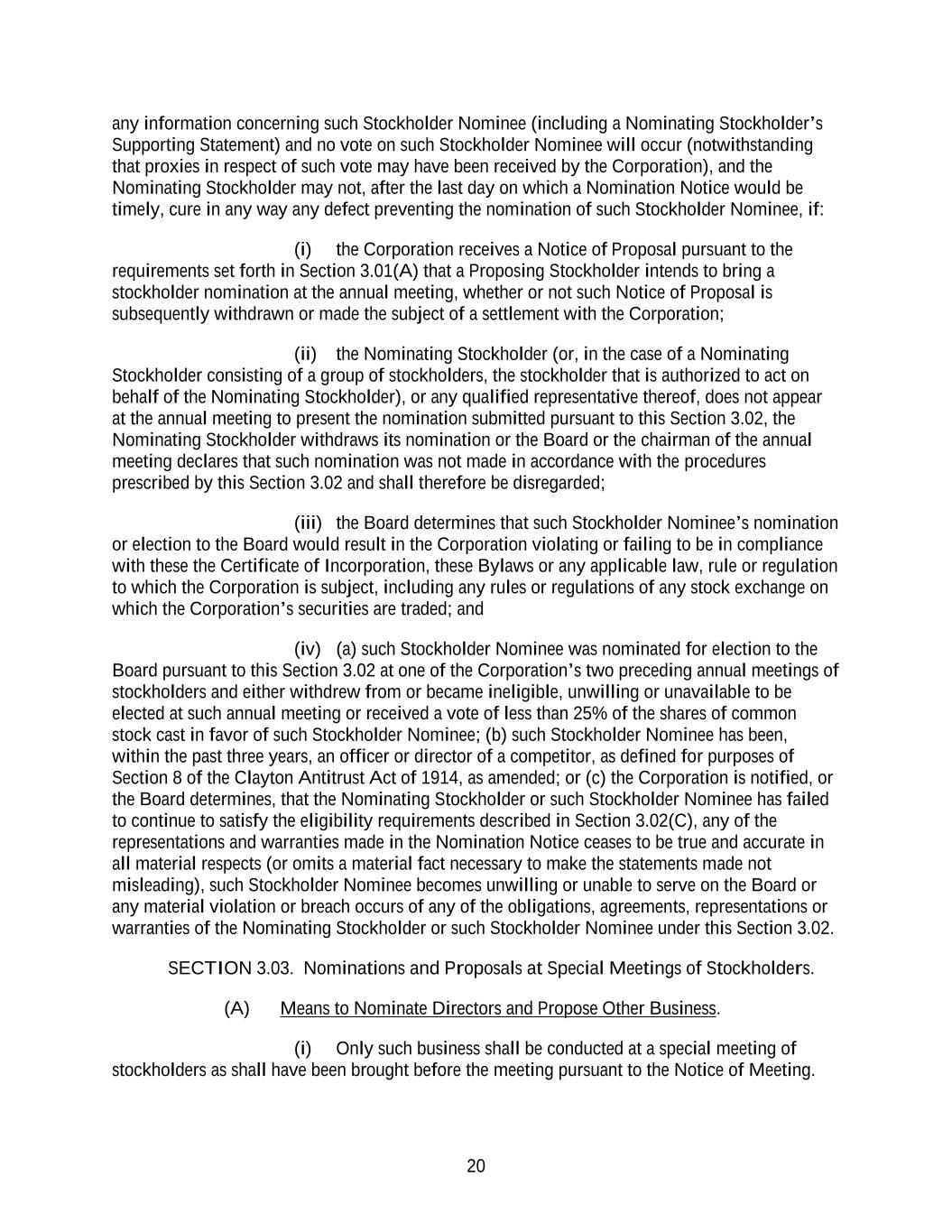 20 any information concerning such Stockholder Nominee (including a Nominating Stockholder’s Supporting Statement) and no vote on such Stockholder Nominee will occur (notwithstanding that proxies in respect of such vote may have been received by the Corporation), and the Nominating Stockholder may not, after the last day on which a Nomination Notice would be timely, cure in any way any defect preventing the nomination of such Stockholder Nominee, if: (i) the Corporation receives a Notice of Proposal pursuant to the requirements set forth in Section 3.01(A) that a Proposing Stockholder intends to bring a stockholder nomination at the annual meeting, whether or not such Notice of Proposal is subsequently withdrawn or made the subject of a settlement with the Corporation; (ii) the Nominating Stockholder (or, in the case of a Nominating Stockholder consisting of a group of stockholders, the stockholder that is authorized to act on behalf of the Nominating Stockholder), or any qualified representative thereof, does not appear at the annual meeting to present the nomination submitted pursuant to this Section 3.02, the Nominating Stockholder withdraws its nomination or the Board or the chairman of the annual meeting declares that such nomination was not made in accordance with the procedures prescribed by this Section 3.02 and shall therefore be disregarded; (iii) the Board determines that such Stockholder Nominee’s nomination or election to the Board would result in the Corporation violating or failing to be in compliance with these the Certificate of Incorporation, these Bylaws or any applicable law, rule or regulation to which the Corporation is subject, including any rules or regulations of any stock exchange on which the Corporation’s securities are traded; and (iv) (a) such Stockholder Nominee was nominated for election to the Board pursuant to this Section 3.02 at one of the Corporation’s two preceding annual meetings of stockholders and either withdrew from or became ineligible, unwilling or unavailable to be elected at such annual meeting or received a vote of less than 25% of the shares of common stock cast in favor of such Stockholder Nominee; (b) such Stockholder Nominee has been, within the past three years, an officer or director of a competitor, as defined for purposes of Section 8 of the Clayton Antitrust Act of 1914, as amended; or (c) the Corporation is notified, or the Board determines, that the Nominating Stockholder or such Stockholder Nominee has failed to continue to satisfy the eligibility requirements described in Section 3.02(C), any of the representations and warranties made in the Nomination Notice ceases to be true and accurate in all material respects (or omits a material fact necessary to make the statements made not misleading), such Stockholder Nominee becomes unwilling or unable to serve on the Board or any material violation or breach occurs of any of the obligations, agreements, representations or warranties of the Nominating Stockholder or such Stockholder Nominee under this Section 3.02. SECTION 3.03. Nominations and Proposals at Special Meetings of Stockholders. (A) Means to Nominate Directors and Propose Other Business. (i) Only such business shall be conducted at a special meeting of stockholders as shall have been brought before the meeting pursuant to the Notice of Meeting.