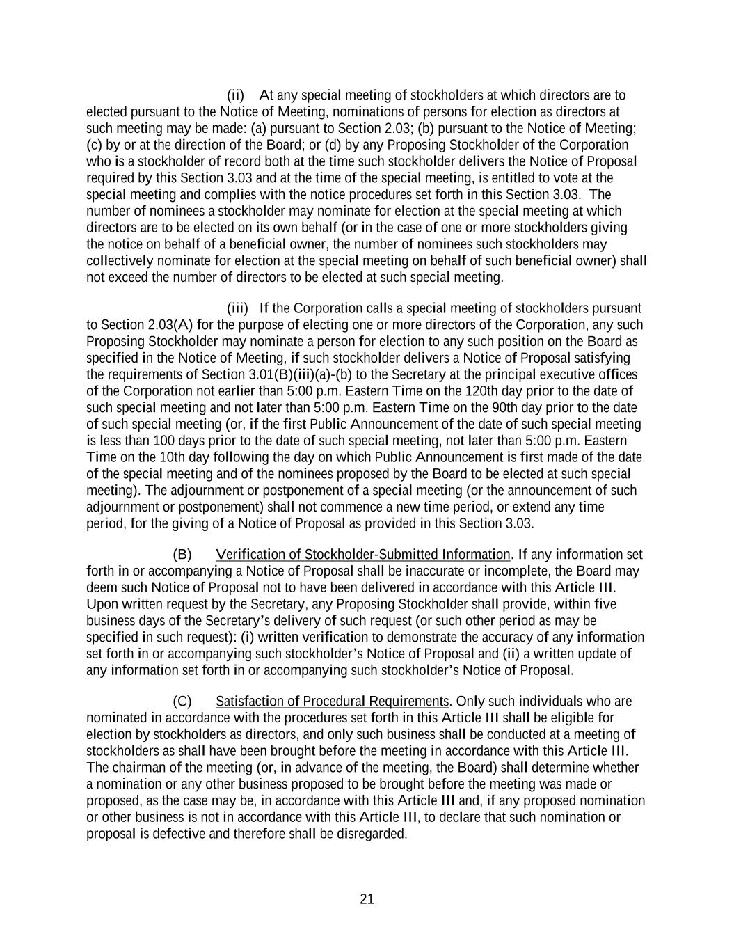 21 (ii) At any special meeting of stockholders at which directors are to elected pursuant to the Notice of Meeting, nominations of persons for election as directors at such meeting may be made: (a) pursuant to Section 2.03; (b) pursuant to the Notice of Meeting; (c) by or at the direction of the Board; or (d) by any Proposing Stockholder of the Corporation who is a stockholder of record both at the time such stockholder delivers the Notice of Proposal required by this Section 3.03 and at the time of the special meeting, is entitled to vote at the special meeting and complies with the notice procedures set forth in this Section 3.03. The number of nominees a stockholder may nominate for election at the special meeting at which directors are to be elected on its own behalf (or in the case of one or more stockholders giving the notice on behalf of a beneficial owner, the number of nominees such stockholders may collectively nominate for election at the special meeting on behalf of such beneficial owner) shall not exceed the number of directors to be elected at such special meeting. (iii) If the Corporation calls a special meeting of stockholders pursuant to Section 2.03(A) for the purpose of electing one or more directors of the Corporation, any such Proposing Stockholder may nominate a person for election to any such position on the Board as specified in the Notice of Meeting, if such stockholder delivers a Notice of Proposal satisfying the requirements of Section 3.01(B)(iii)(a)-(b) to the Secretary at the principal executive offices of the Corporation not earlier than 5:00 p.m. Eastern Time on the 120th day prior to the date of such special meeting and not later than 5:00 p.m. Eastern Time on the 90th day prior to the date of such special meeting (or, if the first Public Announcement of the date of such special meeting is less than 100 days prior to the date of such special meeting, not later than 5:00 p.m. Eastern Time on the 10th day following the day on which Public Announcement is first made of the date of the special meeting and of the nominees proposed by the Board to be elected at such special meeting). The adjournment or postponement of a special meeting (or the announcement of such adjournment or postponement) shall not commence a new time period, or extend any time period, for the giving of a Notice of Proposal as provided in this Section 3.03. (B) Verification of Stockholder-Submitted Information. If any information set forth in or accompanying a Notice of Proposal shall be inaccurate or incomplete, the Board may deem such Notice of Proposal not to have been delivered in accordance with this Article III. Upon written request by the Secretary, any Proposing Stockholder shall provide, within five business days of the Secretary’s delivery of such request (or such other period as may be specified in such request): (i) written verification to demonstrate the accuracy of any information set forth in or accompanying such stockholder’s Notice of Proposal and (ii) a written update of any information set forth in or accompanying such stockholder’s Notice of Proposal. (C) Satisfaction of Procedural Requirements. Only such individuals who are nominated in accordance with the procedures set forth in this Article III shall be eligible for election by stockholders as directors, and only such business shall be conducted at a meeting of stockholders as shall have been brought before the meeting in accordance with this Article III. The chairman of the meeting (or, in advance of the meeting, the Board) shall determine whether a nomination or any other business proposed to be brought before the meeting was made or proposed, as the case may be, in accordance with this Article III and, if any proposed nomination or other business is not in accordance with this Article III, to declare that such nomination or proposal is defective and therefore shall be disregarded.