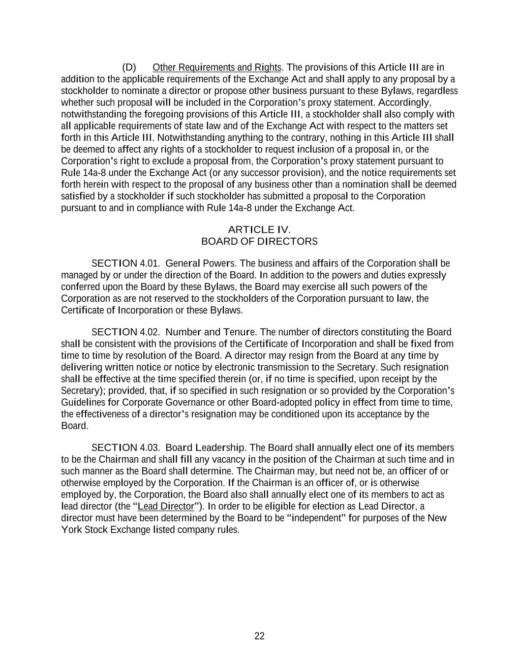 22 (D) Other Requirements and Rights. The provisions of this Article III are in addition to the applicable requirements of the Exchange Act and shall apply to any proposal by a stockholder to nominate a director or propose other business pursuant to these Bylaws, regardless whether such proposal will be included in the Corporation’s proxy statement. Accordingly, notwithstanding the foregoing provisions of this Article III, a stockholder shall also comply with all applicable requirements of state law and of the Exchange Act with respect to the matters set forth in this Article III. Notwithstanding anything to the contrary, nothing in this Article III shall be deemed to affect any rights of a stockholder to request inclusion of a proposal in, or the Corporation’s right to exclude a proposal from, the Corporation’s proxy statement pursuant to Rule 14a-8 under the Exchange Act (or any successor provision), and the notice requirements set forth herein with respect to the proposal of any business other than a nomination shall be deemed satisfied by a stockholder if such stockholder has submitted a proposal to the Corporation pursuant to and in compliance with Rule 14a-8 under the Exchange Act. ARTICLE IV. BOARD OF DIRECTORS SECTION 4.01. General Powers. The business and affairs of the Corporation shall be managed by or under the direction of the Board. In addition to the powers and duties expressly conferred upon the Board by these Bylaws, the Board may exercise all such powers of the Corporation as are not reserved to the stockholders of the Corporation pursuant to law, the Certificate of Incorporation or these Bylaws. SECTION 4.02. Number and Tenure. The number of directors constituting the Board shall be consistent with the provisions of the Certificate of Incorporation and shall be fixed from time to time by resolution of the Board. A director may resign from the Board at any time by delivering written notice or notice by electronic transmission to the Secretary. Such resignation shall be effective at the time specified therein (or, if no time is specified, upon receipt by the Secretary); provided, that, if so specified in such resignation or so provided by the Corporation’s Guidelines for Corporate Governance or other Board-adopted policy in effect from time to time, the effectiveness of a director’s resignation may be conditioned upon its acceptance by the Board. SECTION 4.03. Board Leadership. The Board shall annually elect one of its members to be the Chairman and shall fill any vacancy in the position of the Chairman at such time and in such manner as the Board shall determine. The Chairman may, but need not be, an officer of or otherwise employed by the Corporation. If the Chairman is an officer of, or is otherwise employed by, the Corporation, the Board also shall annually elect one of its members to act as lead director (the “Lead Director”). In order to be eligible for election as Lead Director, a director must have been determined by the Board to be “independent” for purposes of the New York Stock Exchange listed company rules.