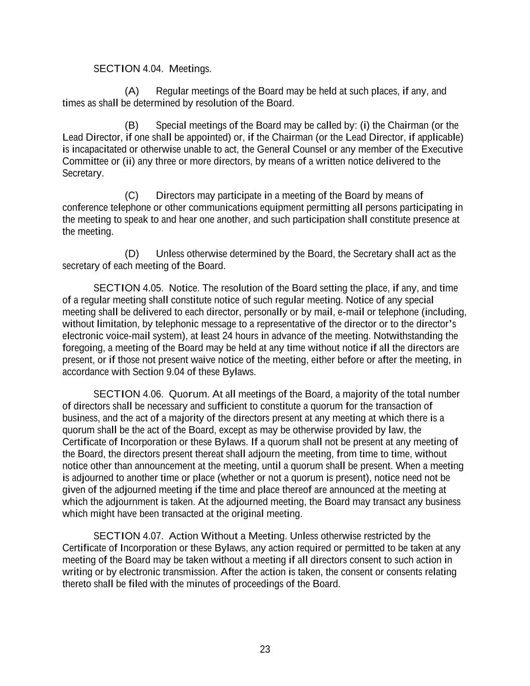 23 SECTION 4.04. Meetings. (A) Regular meetings of the Board may be held at such places, if any, and times as shall be determined by resolution of the Board. (B) Special meetings of the Board may be called by: (i) the Chairman (or the Lead Director, if one shall be appointed) or, if the Chairman (or the Lead Director, if applicable) is incapacitated or otherwise unable to act, the General Counsel or any member of the Executive Committee or (ii) any three or more directors, by means of a written notice delivered to the Secretary. (C) Directors may participate in a meeting of the Board by means of conference telephone or other communications equipment permitting all persons participating in the meeting to speak to and hear one another, and such participation shall constitute presence at the meeting. (D) Unless otherwise determined by the Board, the Secretary shall act as the secretary of each meeting of the Board. SECTION 4.05. Notice. The resolution of the Board setting the place, if any, and time of a regular meeting shall constitute notice of such regular meeting. Notice of any special meeting shall be delivered to each director, personally or by mail, e-mail or telephone (including, without limitation, by telephonic message to a representative of the director or to the director’s electronic voice-mail system), at least 24 hours in advance of the meeting. Notwithstanding the foregoing, a meeting of the Board may be held at any time without notice if all the directors are present, or if those not present waive notice of the meeting, either before or after the meeting, in accordance with Section 9.04 of these Bylaws. SECTION 4.06. Quorum. At all meetings of the Board, a majority of the total number of directors shall be necessary and sufficient to constitute a quorum for the transaction of business, and the act of a majority of the directors present at any meeting at which there is a quorum shall be the act of the Board, except as may be otherwise provided by law, the Certificate of Incorporation or these Bylaws. If a quorum shall not be present at any meeting of the Board, the directors present thereat shall adjourn the meeting, from time to time, without notice other than announcement at the meeting, until a quorum shall be present. When a meeting is adjourned to another time or place (whether or not a quorum is present), notice need not be given of the adjourned meeting if the time and place thereof are announced at the meeting at which the adjournment is taken. At the adjourned meeting, the Board may transact any business which might have been transacted at the original meeting. SECTION 4.07. Action Without a Meeting. Unless otherwise restricted by the Certificate of Incorporation or these Bylaws, any action required or permitted to be taken at any meeting of the Board may be taken without a meeting if all directors consent to such action in writing or by electronic transmission. After the action is taken, the consent or consents relating thereto shall be filed with the minutes of proceedings of the Board.