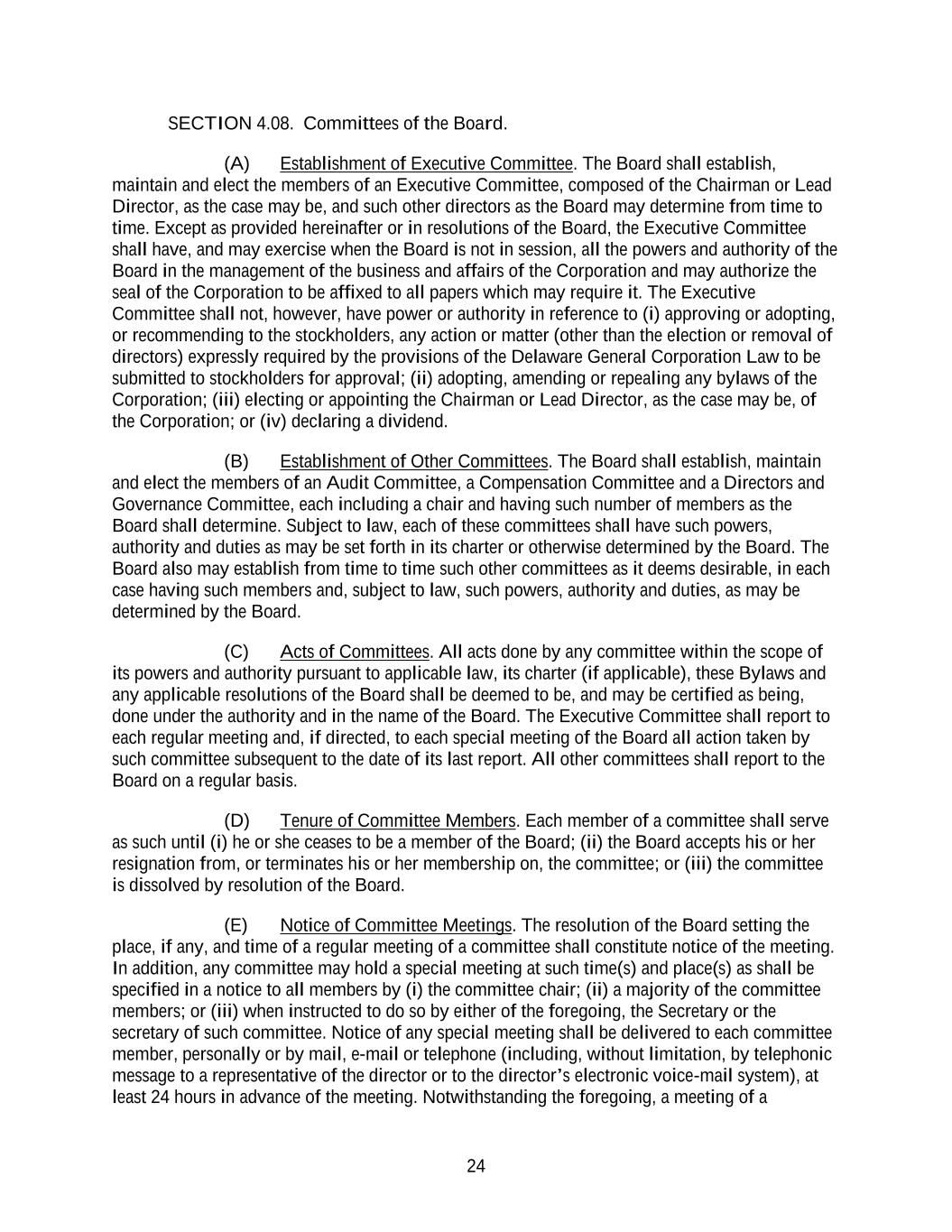 24 SECTION 4.08. Committees of the Board. (A) Establishment of Executive Committee. The Board shall establish, maintain and elect the members of an Executive Committee, composed of the Chairman or Lead Director, as the case may be, and such other directors as the Board may determine from time to time. Except as provided hereinafter or in resolutions of the Board, the Executive Committee shall have, and may exercise when the Board is not in session, all the powers and authority of the Board in the management of the business and affairs of the Corporation and may authorize the seal of the Corporation to be affixed to all papers which may require it. The Executive Committee shall not, however, have power or authority in reference to (i) approving or adopting, or recommending to the stockholders, any action or matter (other than the election or removal of directors) expressly required by the provisions of the Delaware General Corporation Law to be submitted to stockholders for approval; (ii) adopting, amending or repealing any bylaws of the Corporation; (iii) electing or appointing the Chairman or Lead Director, as the case may be, of the Corporation; or (iv) declaring a dividend. (B) Establishment of Other Committees. The Board shall establish, maintain and elect the members of an Audit Committee, a Compensation Committee and a Directors and Governance Committee, each including a chair and having such number of members as the Board shall determine. Subject to law, each of these committees shall have such powers, authority and duties as may be set forth in its charter or otherwise determined by the Board. The Board also may establish from time to time such other committees as it deems desirable, in each case having such members and, subject to law, such powers, authority and duties, as may be determined by the Board. (C) Acts of Committees. All acts done by any committee within the scope of its powers and authority pursuant to applicable law, its charter (if applicable), these Bylaws and any applicable resolutions of the Board shall be deemed to be, and may be certified as being, done under the authority and in the name of the Board. The Executive Committee shall report to each regular meeting and, if directed, to each special meeting of the Board all action taken by such committee subsequent to the date of its last report. All other committees shall report to the Board on a regular basis. (D) Tenure of Committee Members. Each member of a committee shall serve as such until (i) he or she ceases to be a member of the Board; (ii) the Board accepts his or her resignation from, or terminates his or her membership on, the committee; or (iii) the committee is dissolved by resolution of the Board. (E) Notice of Committee Meetings. The resolution of the Board setting the place, if any, and time of a regular meeting of a committee shall constitute notice of the meeting. In addition, any committee may hold a special meeting at such time(s) and place(s) as shall be specified in a notice to all members by (i) the committee chair; (ii) a majority of the committee members; or (iii) when instructed to do so by either of the foregoing, the Secretary or the secretary of such committee. Notice of any special meeting shall be delivered to each committee member, personally or by mail, e-mail or telephone (including, without limitation, by telephonic message to a representative of the director or to the director’s electronic voice-mail system), at least 24 hours in advance of the meeting. Notwithstanding the foregoing, a meeting of a
