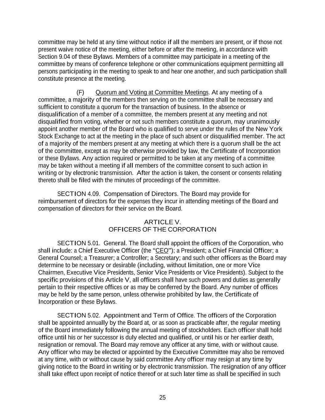 25 committee may be held at any time without notice if all the members are present, or if those not present waive notice of the meeting, either before or after the meeting, in accordance with Section 9.04 of these Bylaws. Members of a committee may participate in a meeting of the committee by means of conference telephone or other communications equipment permitting all persons participating in the meeting to speak to and hear one another, and such participation shall constitute presence at the meeting. (F) Quorum and Voting at Committee Meetings. At any meeting of a committee, a majority of the members then serving on the committee shall be necessary and sufficient to constitute a quorum for the transaction of business. In the absence or disqualification of a member of a committee, the members present at any meeting and not disqualified from voting, whether or not such members constitute a quorum, may unanimously appoint another member of the Board who is qualified to serve under the rules of the New York Stock Exchange to act at the meeting in the place of such absent or disqualified member. The act of a majority of the members present at any meeting at which there is a quorum shall be the act of the committee, except as may be otherwise provided by law, the Certificate of Incorporation or these Bylaws. Any action required or permitted to be taken at any meeting of a committee may be taken without a meeting if all members of the committee consent to such action in writing or by electronic transmission. After the action is taken, the consent or consents relating thereto shall be filed with the minutes of proceedings of the committee. SECTION 4.09. Compensation of Directors. The Board may provide for reimbursement of directors for the expenses they incur in attending meetings of the Board and compensation of directors for their service on the Board. ARTICLE V. OFFICERS OF THE CORPORATION SECTION 5.01. General. The Board shall appoint the officers of the Corporation, who shall include: a Chief Executive Officer (the “CEO”); a President; a Chief Financial Officer; a General Counsel; a Treasurer; a Controller; a Secretary; and such other officers as the Board may determine to be necessary or desirable (including, without limitation, one or more Vice Chairmen, Executive Vice Presidents, Senior Vice Presidents or Vice Presidents). Subject to the specific provisions of this Article V, all officers shall have such powers and duties as generally pertain to their respective offices or as may be conferred by the Board. Any number of offices may be held by the same person, unless otherwise prohibited by law, the Certificate of Incorporation or these Bylaws. SECTION 5.02. Appointment and Term of Office. The officers of the Corporation shall be appointed annually by the Board at, or as soon as practicable after, the regular meeting of the Board immediately following the annual meeting of stockholders. Each officer shall hold office until his or her successor is duly elected and qualified, or until his or her earlier death, resignation or removal. The Board may remove any officer at any time, with or without cause. Any officer who may be elected or appointed by the Executive Committee may also be removed at any time, with or without cause by said committee Any officer may resign at any time by giving notice to the Board in writing or by electronic transmission. The resignation of any officer shall take effect upon receipt of notice thereof or at such later time as shall be specified in such