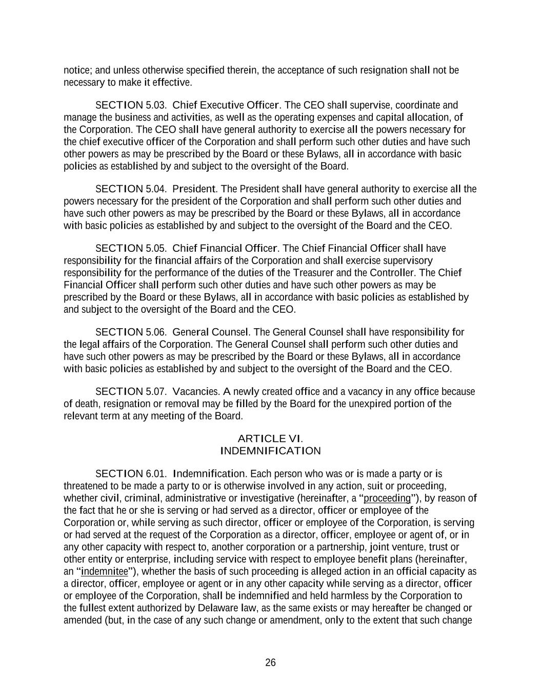 26 notice; and unless otherwise specified therein, the acceptance of such resignation shall not be necessary to make it effective. SECTION 5.03. Chief Executive Officer. The CEO shall supervise, coordinate and manage the business and activities, as well as the operating expenses and capital allocation, of the Corporation. The CEO shall have general authority to exercise all the powers necessary for the chief executive officer of the Corporation and shall perform such other duties and have such other powers as may be prescribed by the Board or these Bylaws, all in accordance with basic policies as established by and subject to the oversight of the Board. SECTION 5.04. President. The President shall have general authority to exercise all the powers necessary for the president of the Corporation and shall perform such other duties and have such other powers as may be prescribed by the Board or these Bylaws, all in accordance with basic policies as established by and subject to the oversight of the Board and the CEO. SECTION 5.05. Chief Financial Officer. The Chief Financial Officer shall have responsibility for the financial affairs of the Corporation and shall exercise supervisory responsibility for the performance of the duties of the Treasurer and the Controller. The Chief Financial Officer shall perform such other duties and have such other powers as may be prescribed by the Board or these Bylaws, all in accordance with basic policies as established by and subject to the oversight of the Board and the CEO. SECTION 5.06. General Counsel. The General Counsel shall have responsibility for the legal affairs of the Corporation. The General Counsel shall perform such other duties and have such other powers as may be prescribed by the Board or these Bylaws, all in accordance with basic policies as established by and subject to the oversight of the Board and the CEO. SECTION 5.07. Vacancies. A newly created office and a vacancy in any office because of death, resignation or removal may be filled by the Board for the unexpired portion of the relevant term at any meeting of the Board. ARTICLE VI. INDEMNIFICATION SECTION 6.01. Indemnification. Each person who was or is made a party or is threatened to be made a party to or is otherwise involved in any action, suit or proceeding, whether civil, criminal, administrative or investigative (hereinafter, a “proceeding”), by reason of the fact that he or she is serving or had served as a director, officer or employee of the Corporation or, while serving as such director, officer or employee of the Corporation, is serving or had served at the request of the Corporation as a director, officer, employee or agent of, or in any other capacity with respect to, another corporation or a partnership, joint venture, trust or other entity or enterprise, including service with respect to employee benefit plans (hereinafter, an “indemnitee”), whether the basis of such proceeding is alleged action in an official capacity as a director, officer, employee or agent or in any other capacity while serving as a director, officer or employee of the Corporation, shall be indemnified and held harmless by the Corporation to the fullest extent authorized by Delaware law, as the same exists or may hereafter be changed or amended (but, in the case of any such change or amendment, only to the extent that such change